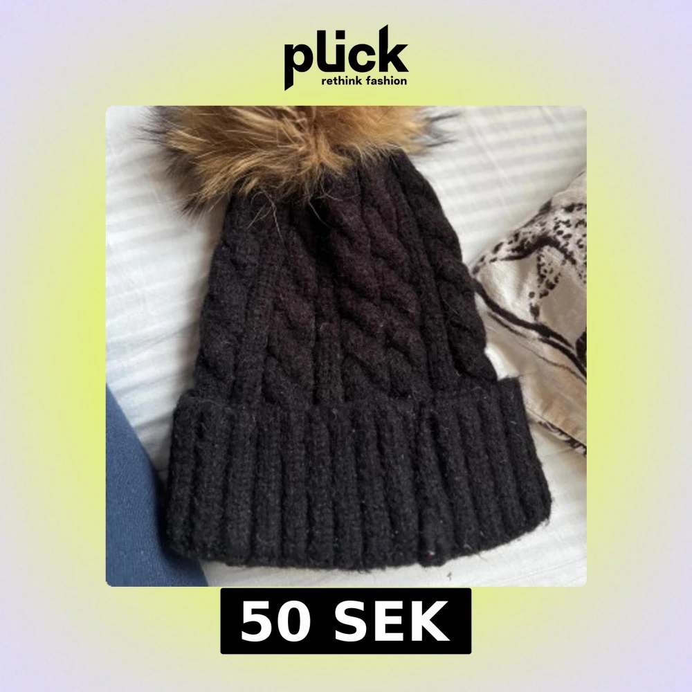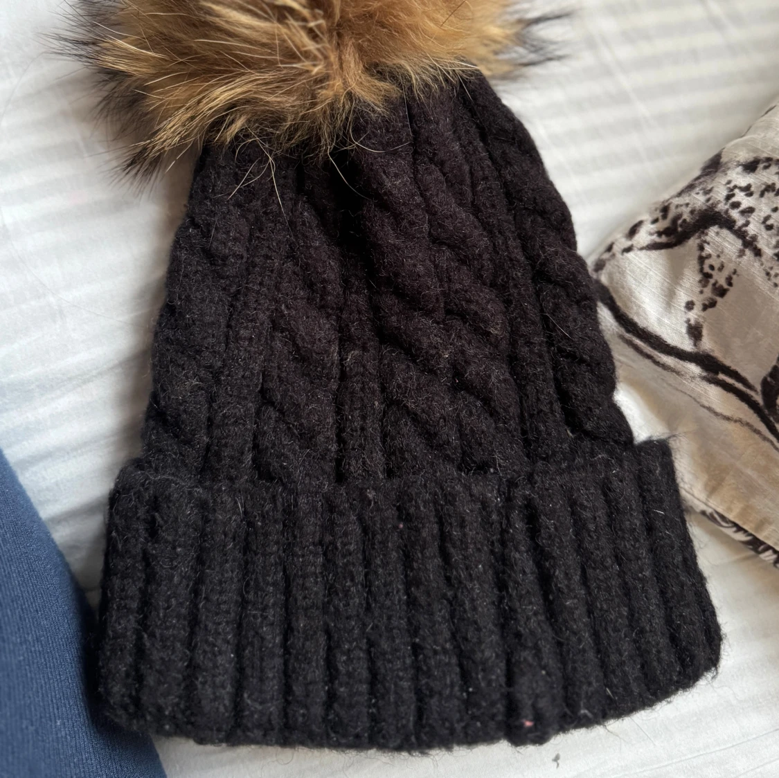 Mysig svart stickad mössa med grovt kabelstickat mönster och en stor, fluffig brun pälsboll på toppen. Perfekt för kalla dagar när du vill hålla dig varm och ändå se snygg ut. Klassisk uppvikt kant för extra värme och stil.