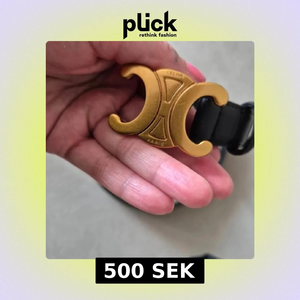 Säljer ett svart bälte med ikoniskt Triomphe-spänne i guld. Bältet är tillverkat i äkta skinn och har en stilren, klassisk form. Spännet är i metall med Celine Paris-gravyr. Perfekt för dig som gillar exklusiva accessoarer med statement-detaljer.