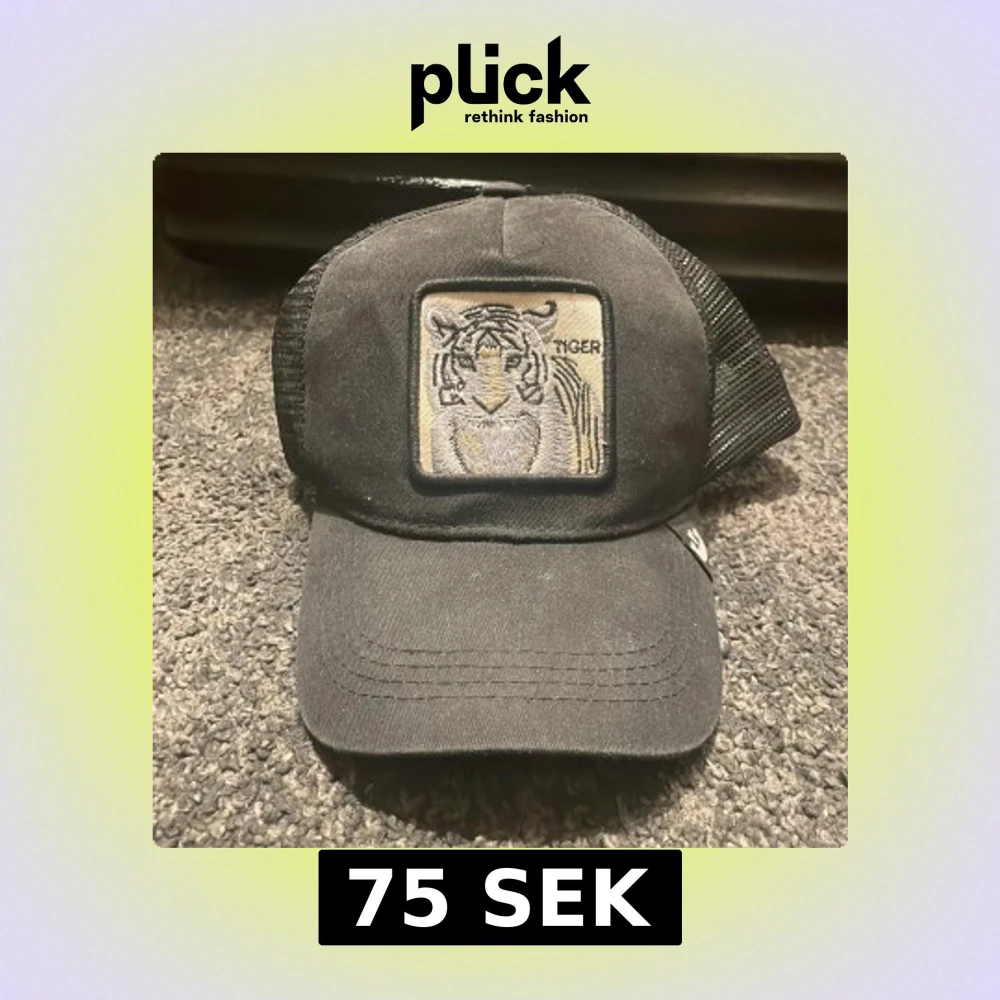 Svart truckerkeps från Goorin Bros med mesh på sidorna och bak. Framtill sitter en fyrkantig patch med broderad tiger och texten 'TIGER'. Kepsen har böjd skärm och justerbar snapback. Perfekt för dig som vill sticka ut med djurmotiv.