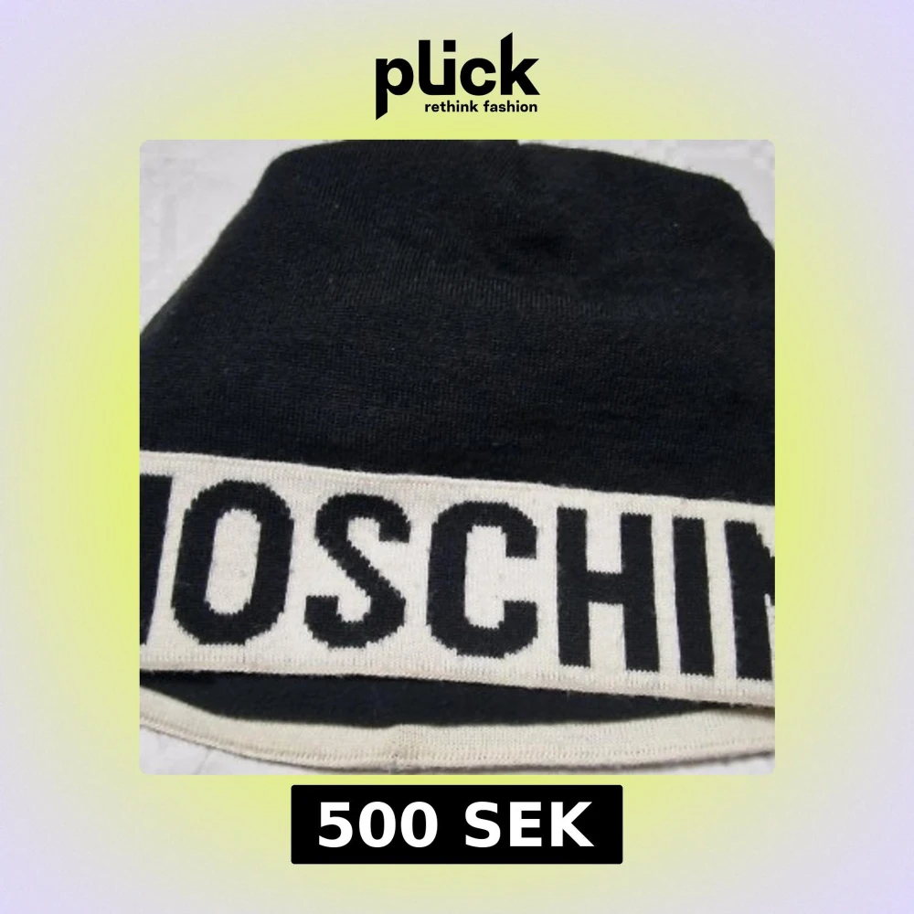 Snygg svart stickad mössa från Moschino med bred vit kant och stor svart logotyp runt om. Perfekt accessoar för att sticka ut i vinterkylan och visa din stil med ett ikoniskt märke.