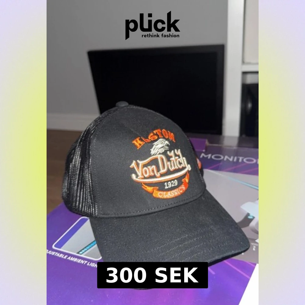 Säljer en Von Dutch med broderad logga i orange och vitt framtill. Kepsen har mesh på sidorna och bak, samt justerbar snapback. Märket syns även på insidan med tryckta band.