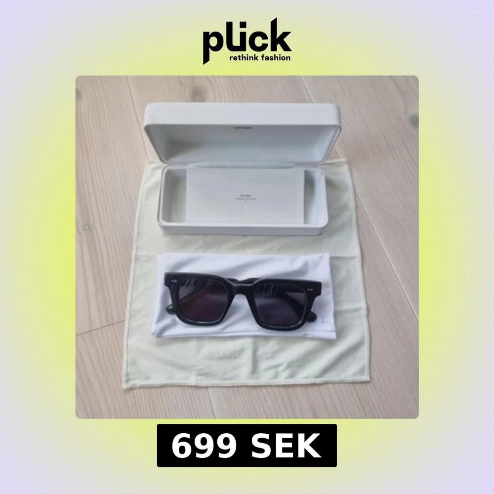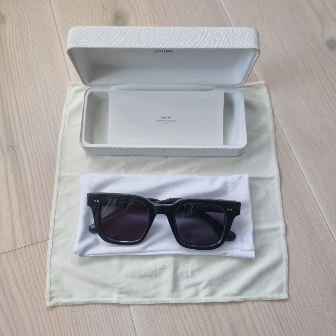 Snygga svarta solglasögon från Chimi med markerad, fyrkantig båge och mörka glas. Kommer med originalfodral och putsduk. Perfekta för dig som vill ha en stilren och modern look.