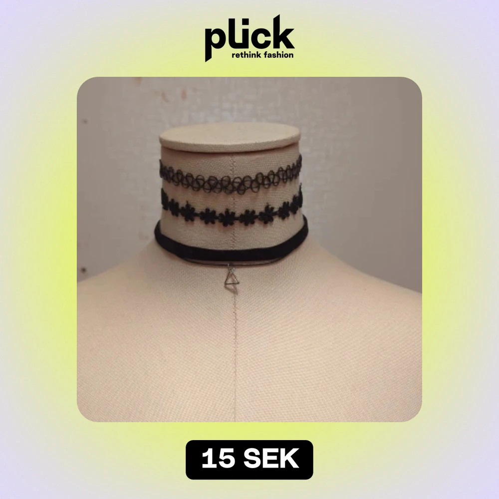 Säljer ett set med tre svarta chokerhalsband. Det första är ett elastiskt, snirkligt mönster som ger en cool 90-talsvibe. Det andra har små blommor som ger en söt och edgy look. Det tredje är ett enkelt svart band med en liten triangelformad hängande detalj. Perfekt för att ge din outfit en extra touch!