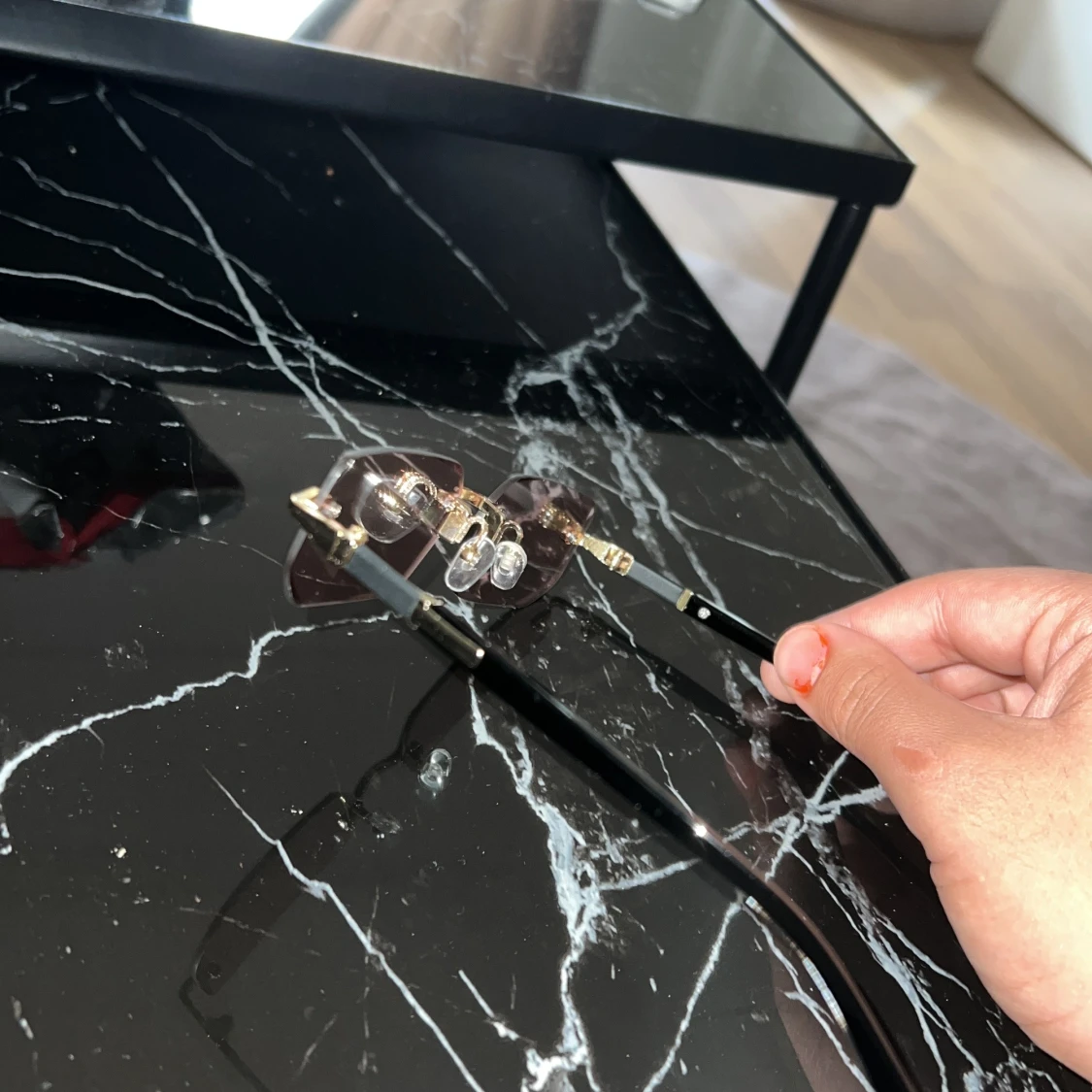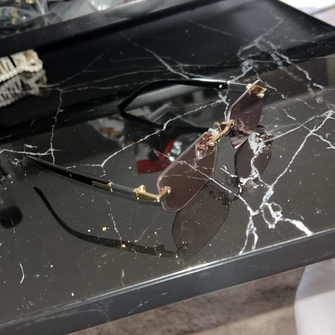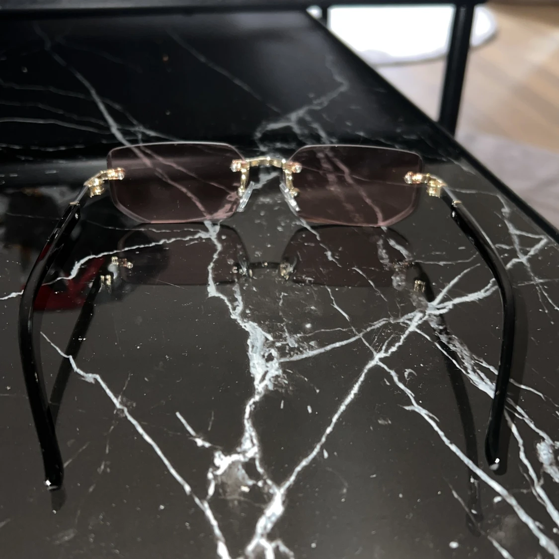 Snygga glasögon med rektangulära linser i en ljus rosa ton, tunna svarta skalmar och detaljer i guld. Glasögonen har näskuddar för extra komfort och en minimalistisk design som ger en modern vibe. Perfekt accessoar för dig som gillar stilrena och trendiga detaljer.