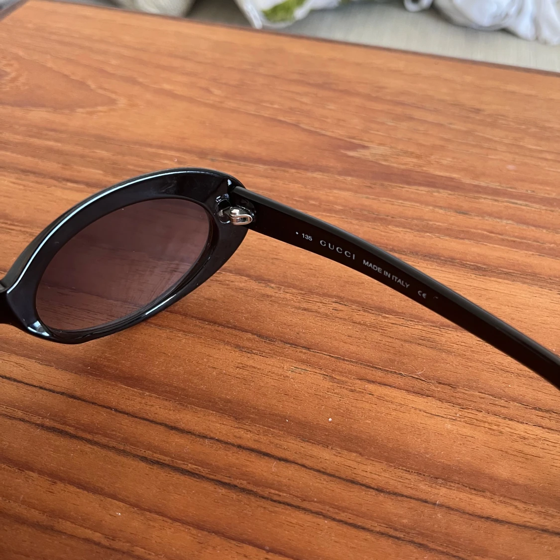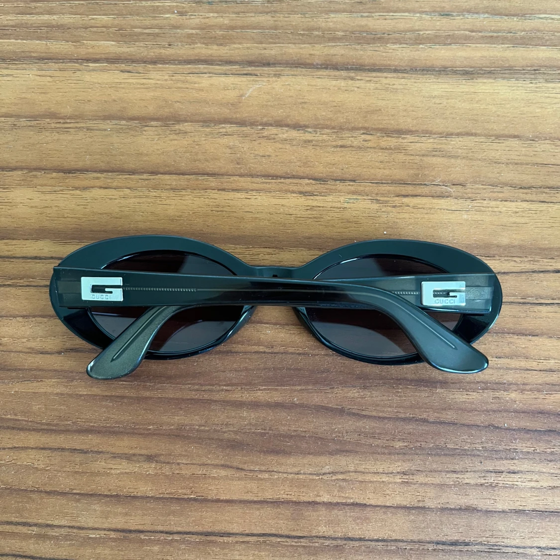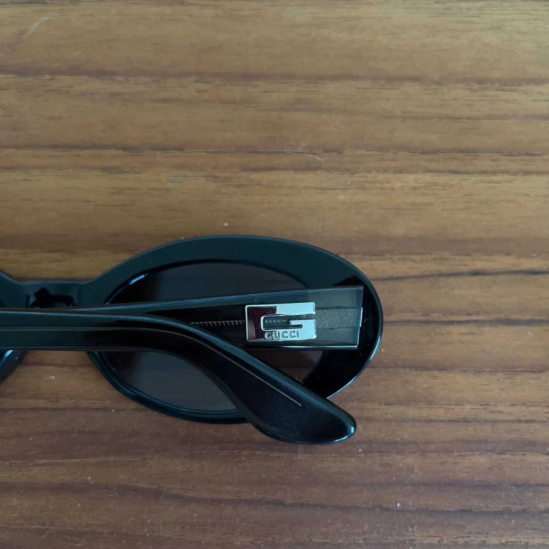 Snygga svarta ovala solglasögon från Gucci med mörka linser. De har en elegant design med märkets logotyp på skalmarna. Perfekta för en stilren look.