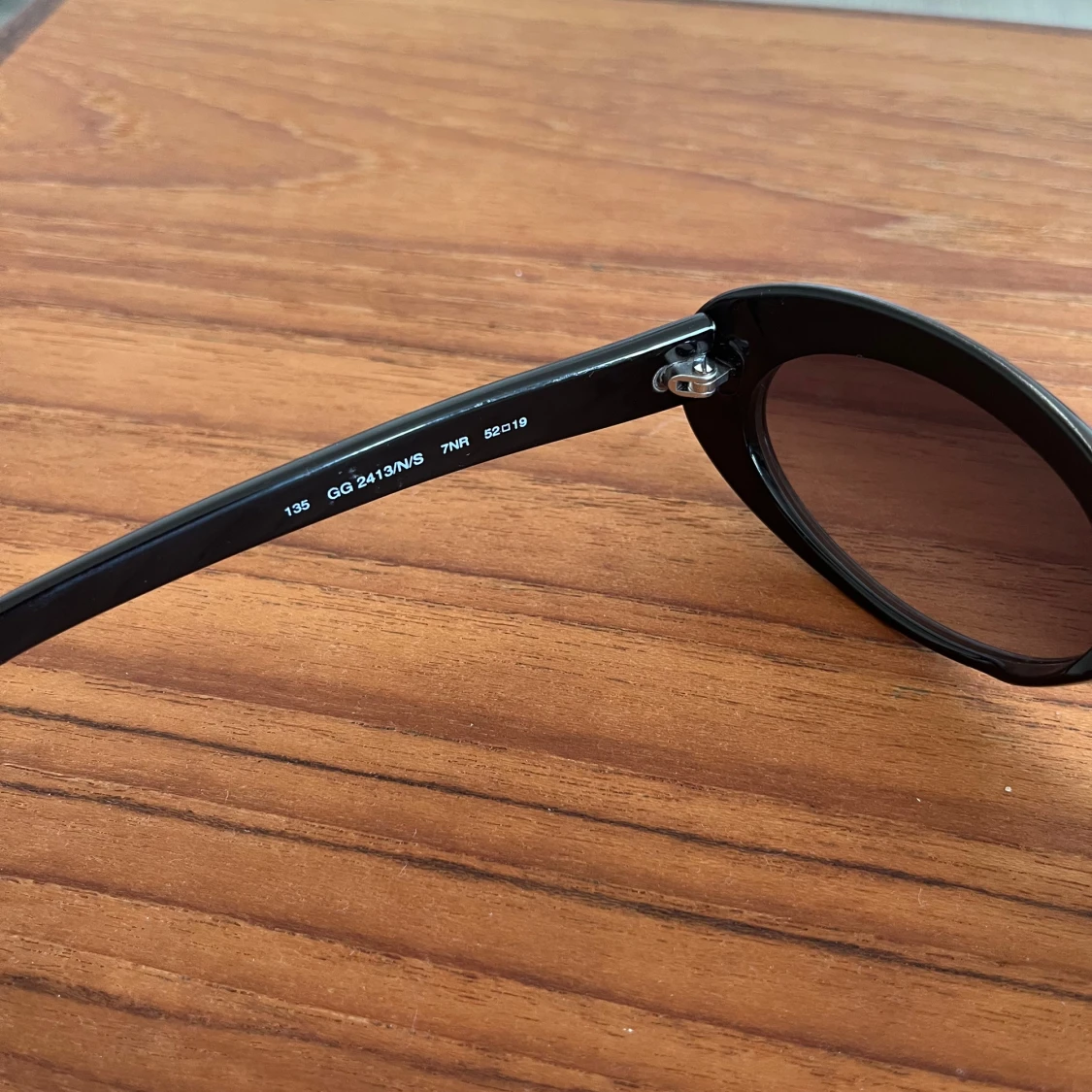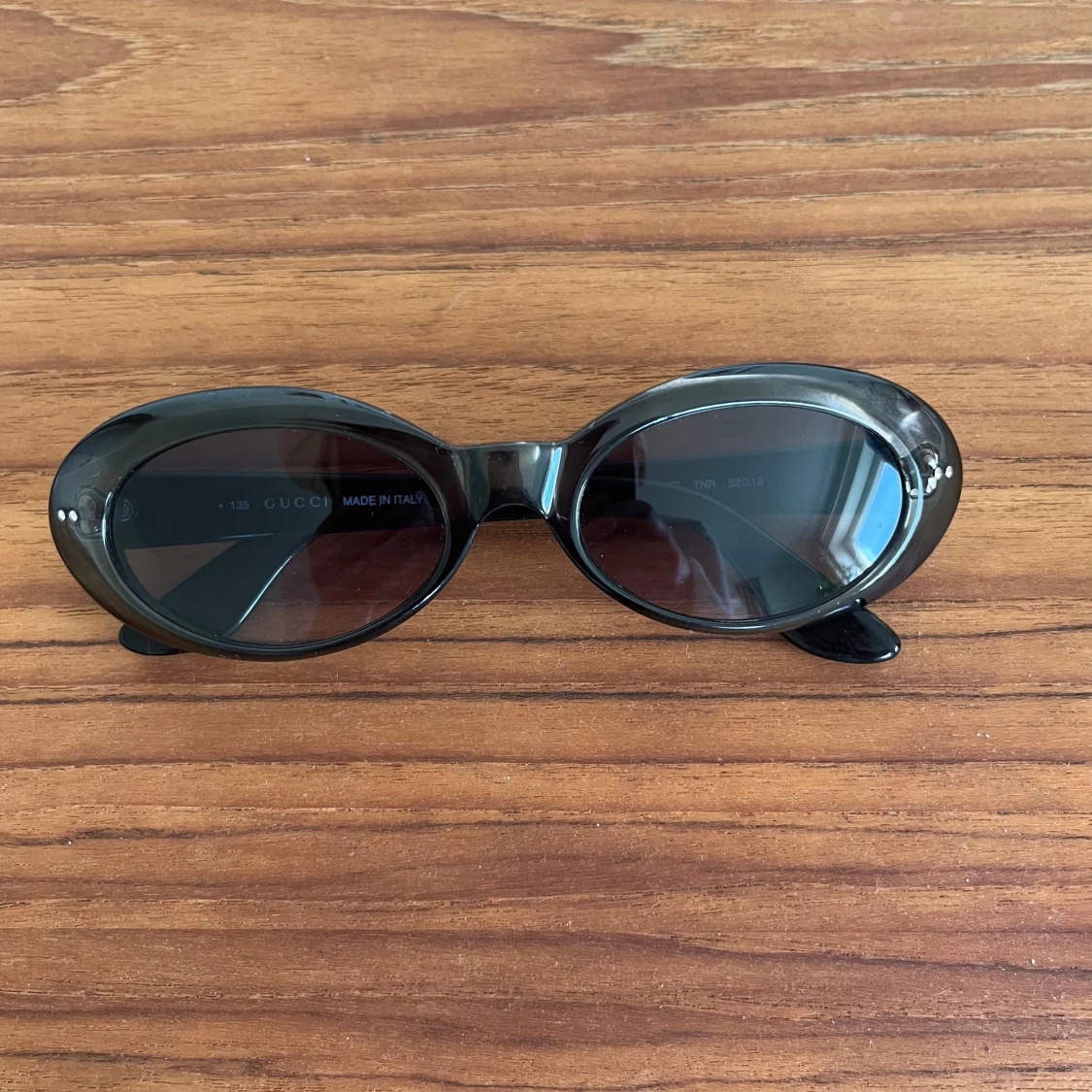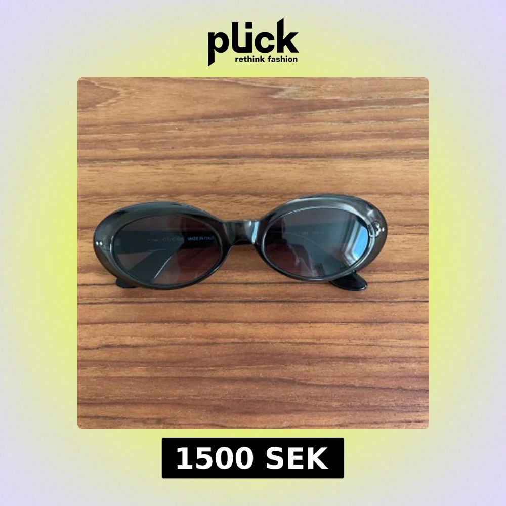 Snygga svarta ovala solglasögon från Gucci med mörka linser. De har en elegant design med märkets logotyp på skalmarna. Perfekta för en stilren look.