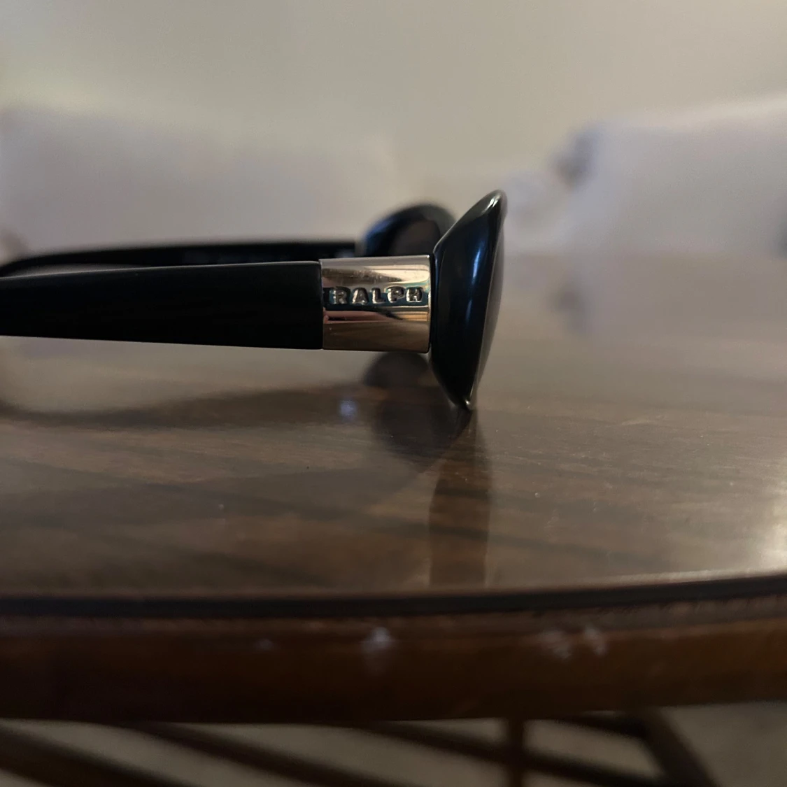 Snygga svarta solglasögon från Ralph med oval form och stilrena bågar. Glasögonen har en diskret guld-detalj vid skalmen där märket är ingraverat. Perfekt accessoar för att höja din look och skydda ögonen mot solen.