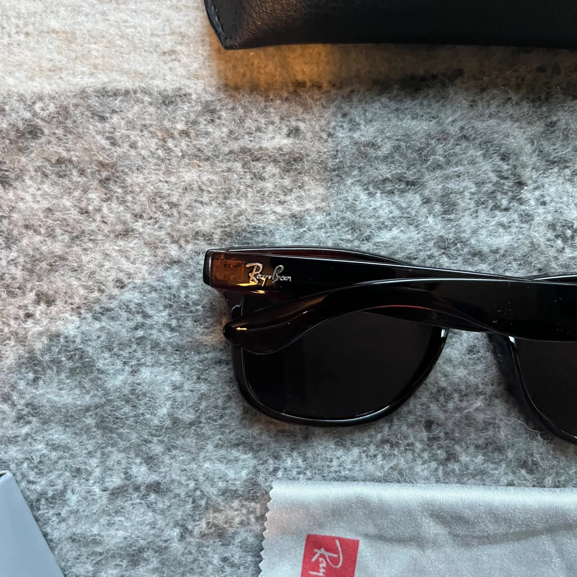 Klassiska svarta Ray-Ban Wayfarer solglasögon med glansig båge och mörka linser. Ikonisk modell med Ray-Ban-logga på skalmen. Kommer med originalfodral, putsduk och box. Perfekt accessoar för en cool och tidlös stil.