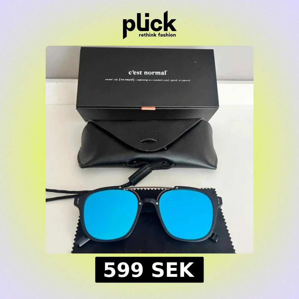 Snygga svarta solglasögon från C'est Normal med coolt blåtonade linser. Bågarna är mattsvarta. Kommer med original svart fodral och box. Perfekt för dig som vill ha en modern och stilren look. Ny pris är 1200kr