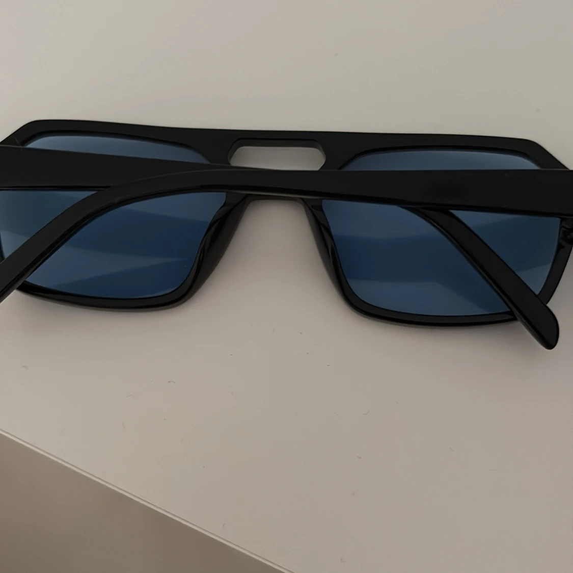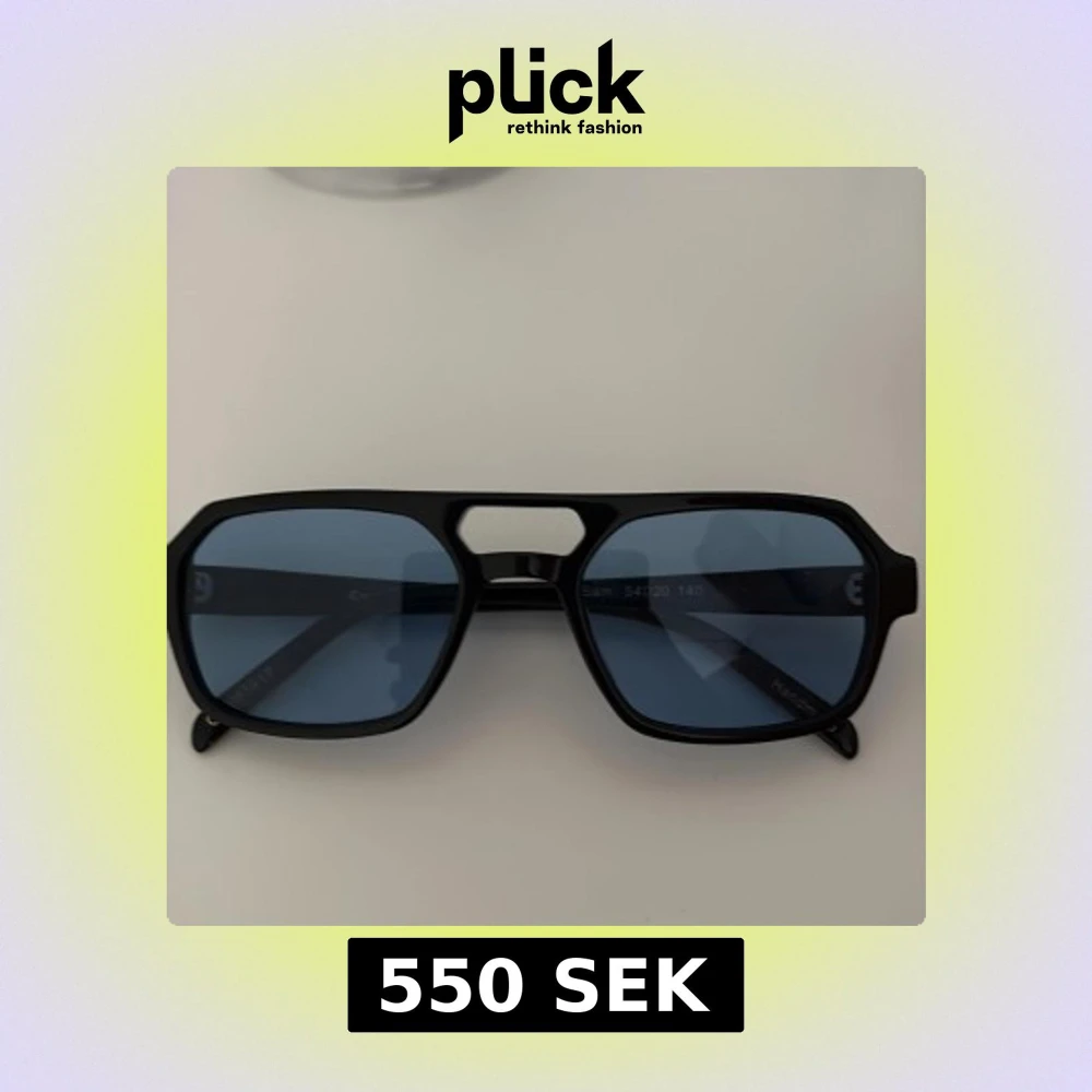 Snygga svarta solglasögon från Corlin Eyewear med blåtonade glas och en modern, kantig form. Bågarna är i blank svart plast och har en cool detalj med öppning vid näsryggen. Perfekta för dig som vill sticka ut med en trendig accessoar.