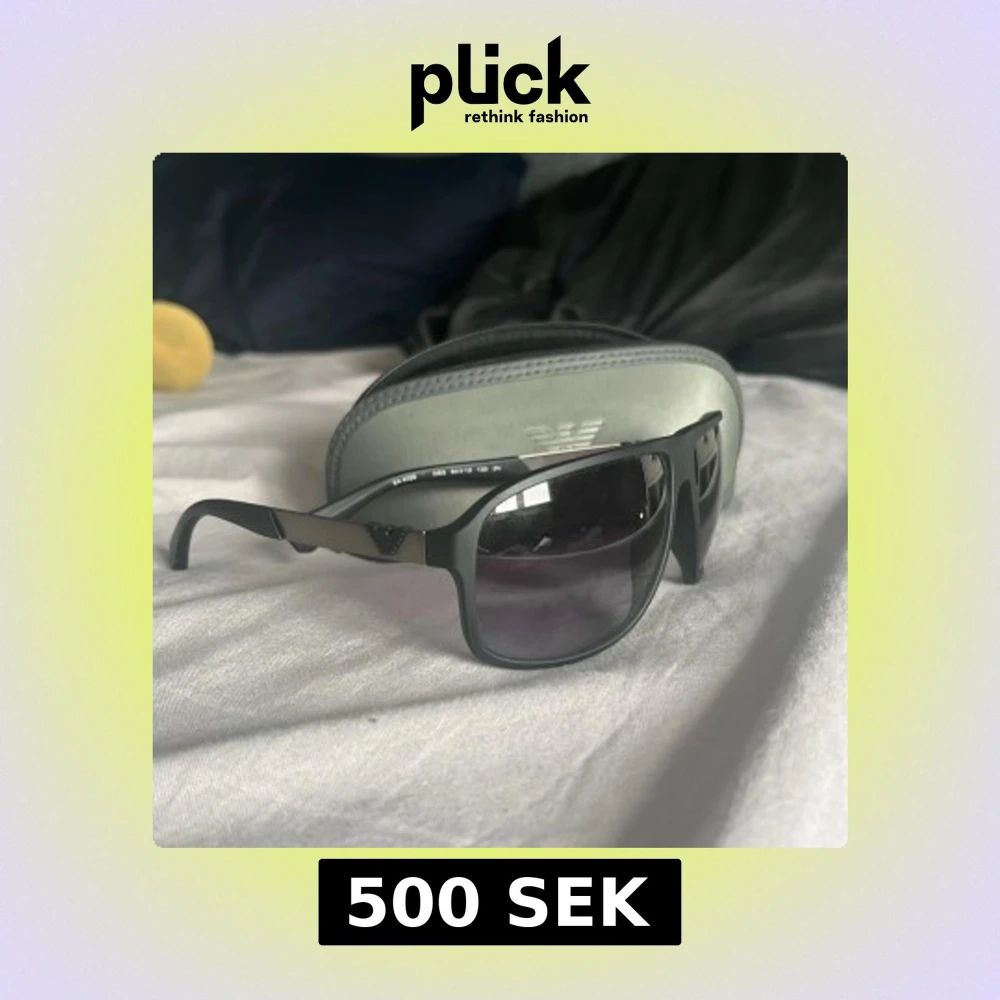 Snygga svarta solglasögon från Emporio Armani med rektangulära bågar och mörka glas. Metall- och plastdetaljer med diskret logga på sidan. Kommer med originalfodral.