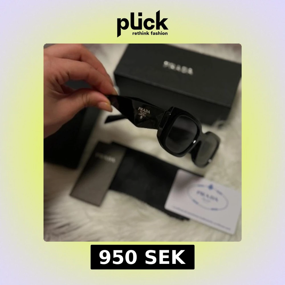 Snygga svarta solglasögon från Prada med fyrkantig form och breda skalmar. Modellen är SPR17NS och har en stilren, modern look med diskret logga på sidan. Tillverkade i blankt syntetmaterial och levereras med originalbox, fodral och certifikat.