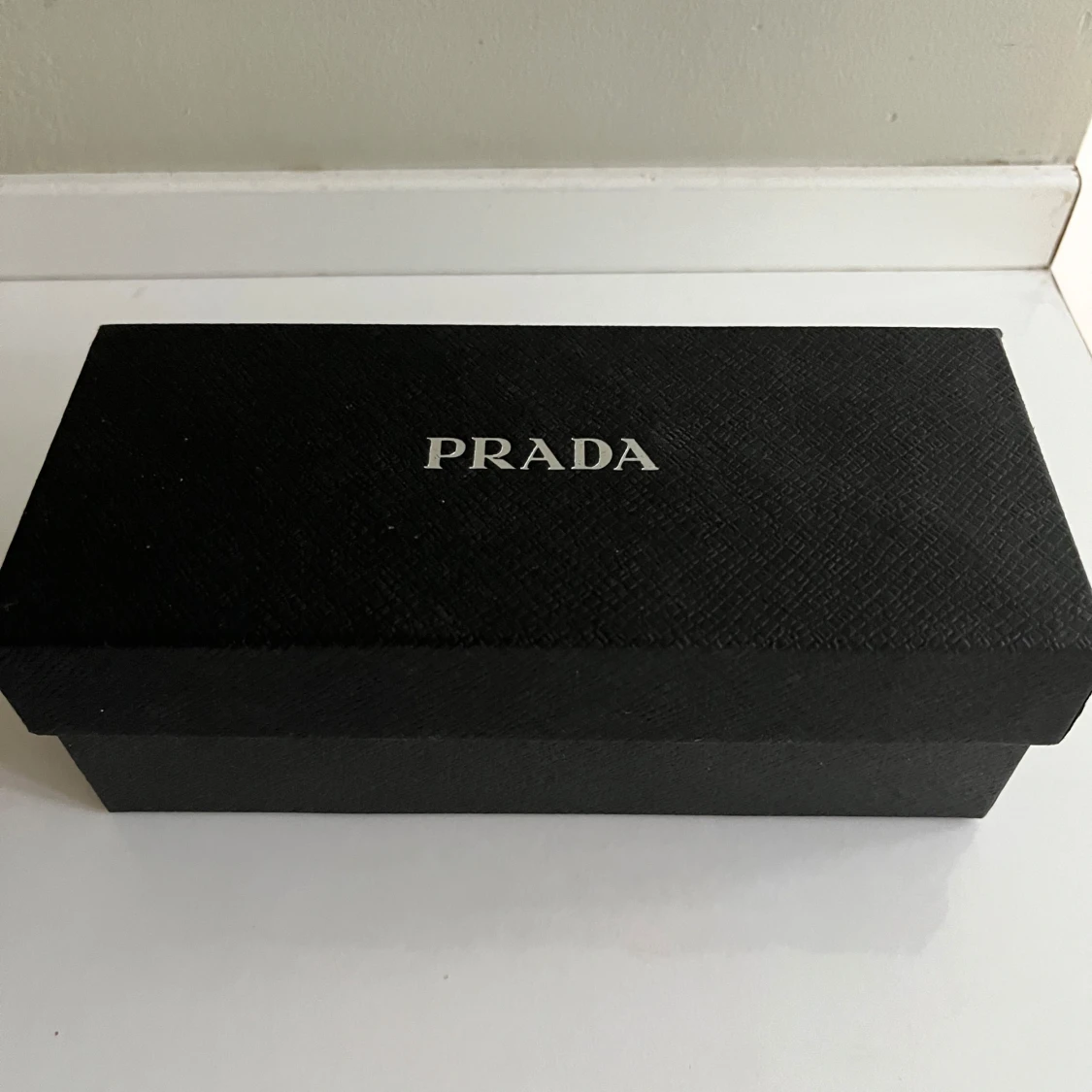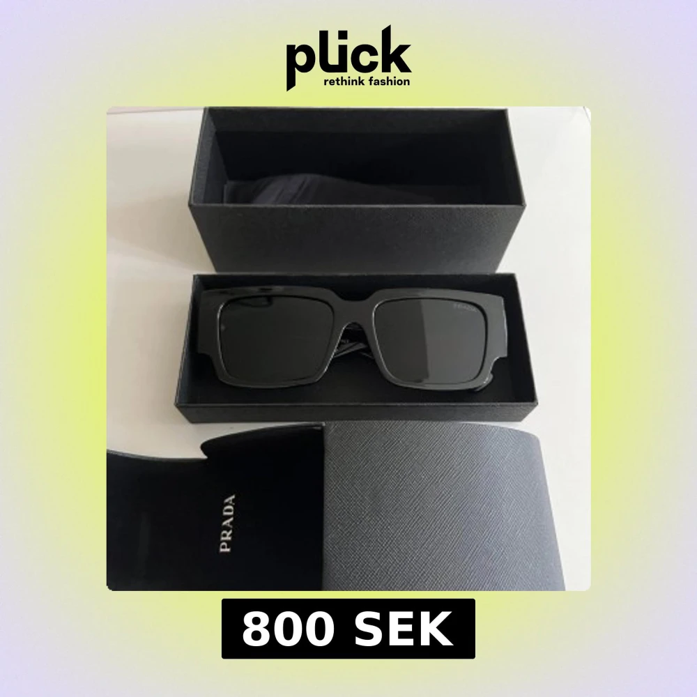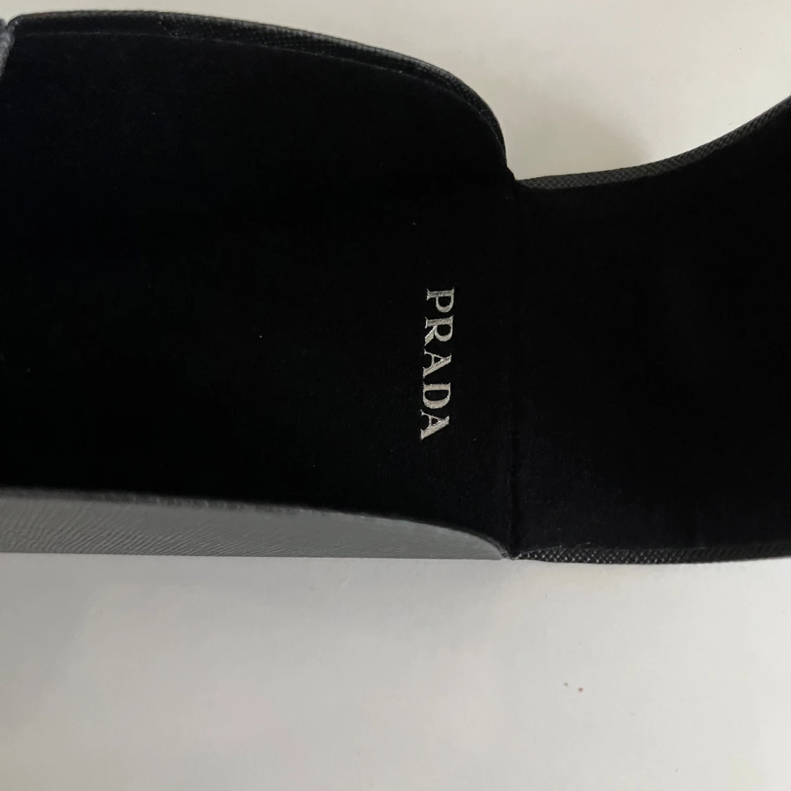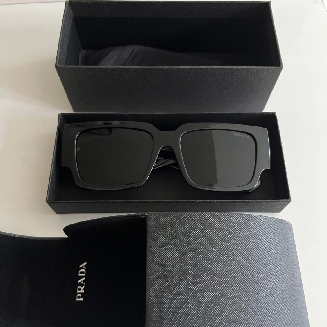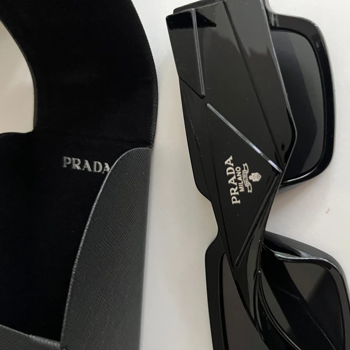 Snygga svarta solglasögon från Prada med rektangulära bågar och coola detaljer på sidorna. Glasögonen har en stilren och modern look med breda skalmar där Prada-loggan syns tydligt. Kommer med originaletui och box.