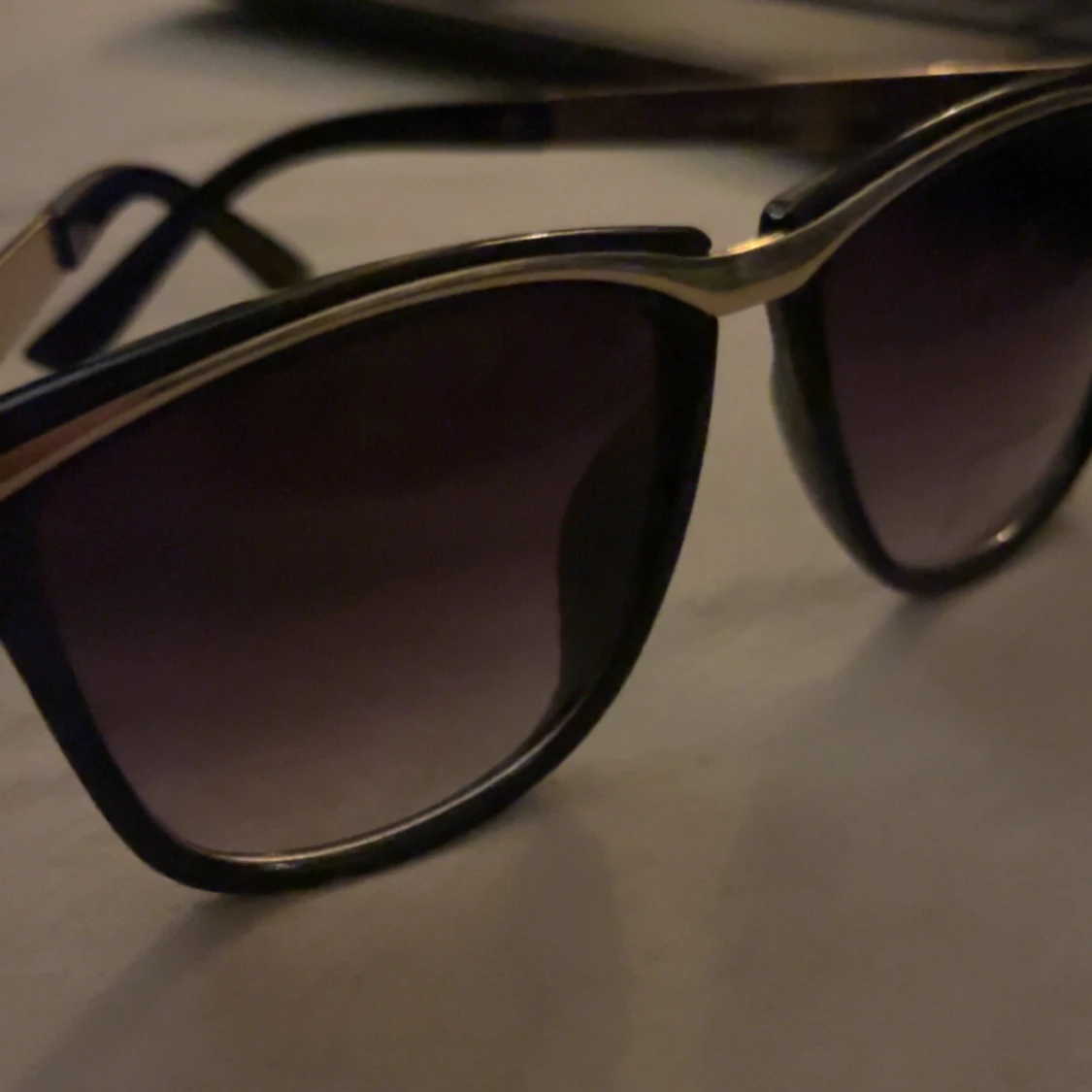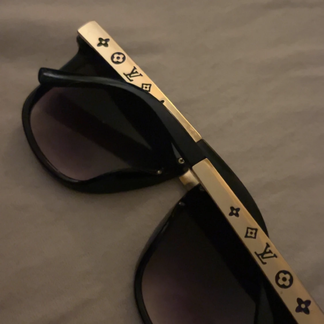 Snygga svarta solglasögon med eleganta gulddetaljer på bågarna. Perfekt för en stilren look med en touch av lyx.