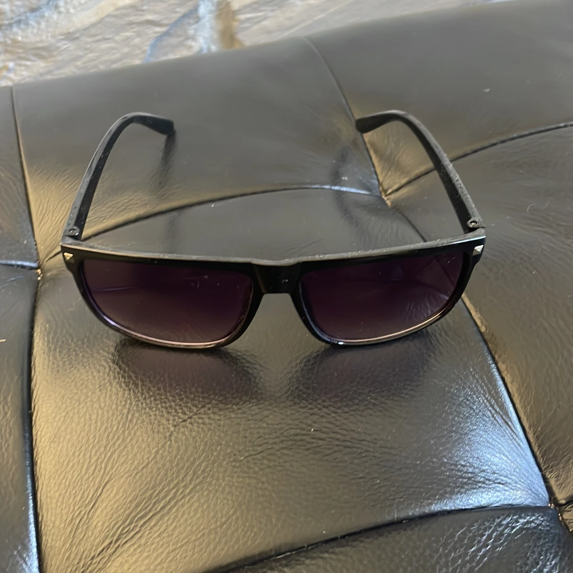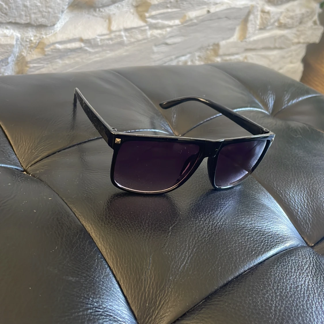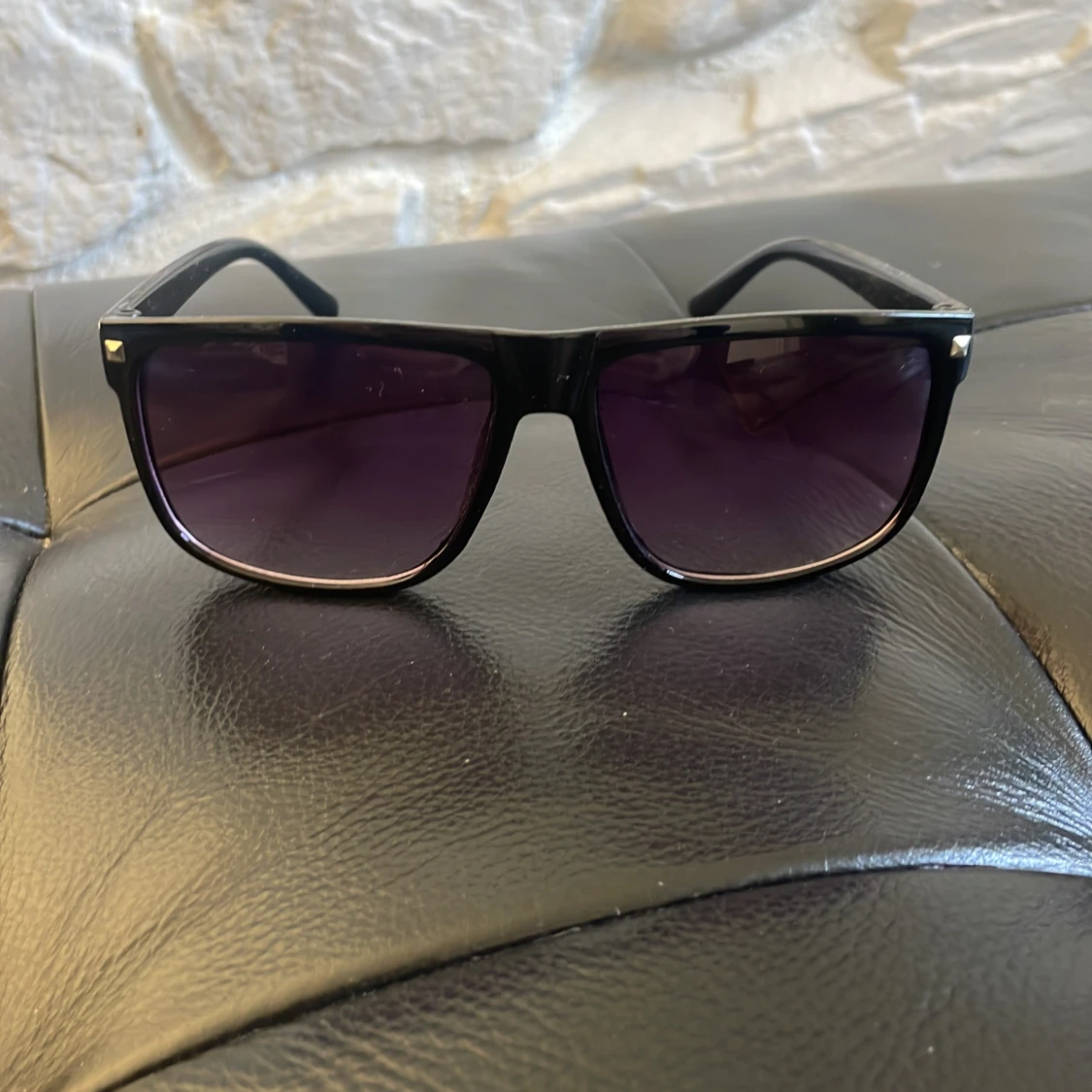 Snygga svarta solglasögon med rektangulär form och lila tonade glas. Klassisk och stilren design med diskreta metalldetaljer i hörnen. Perfekta för att lyfta din look under soliga dagar.
