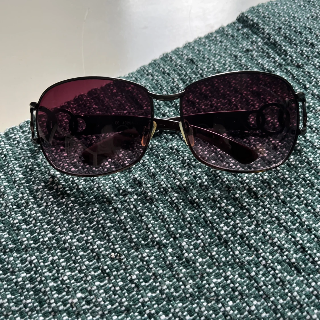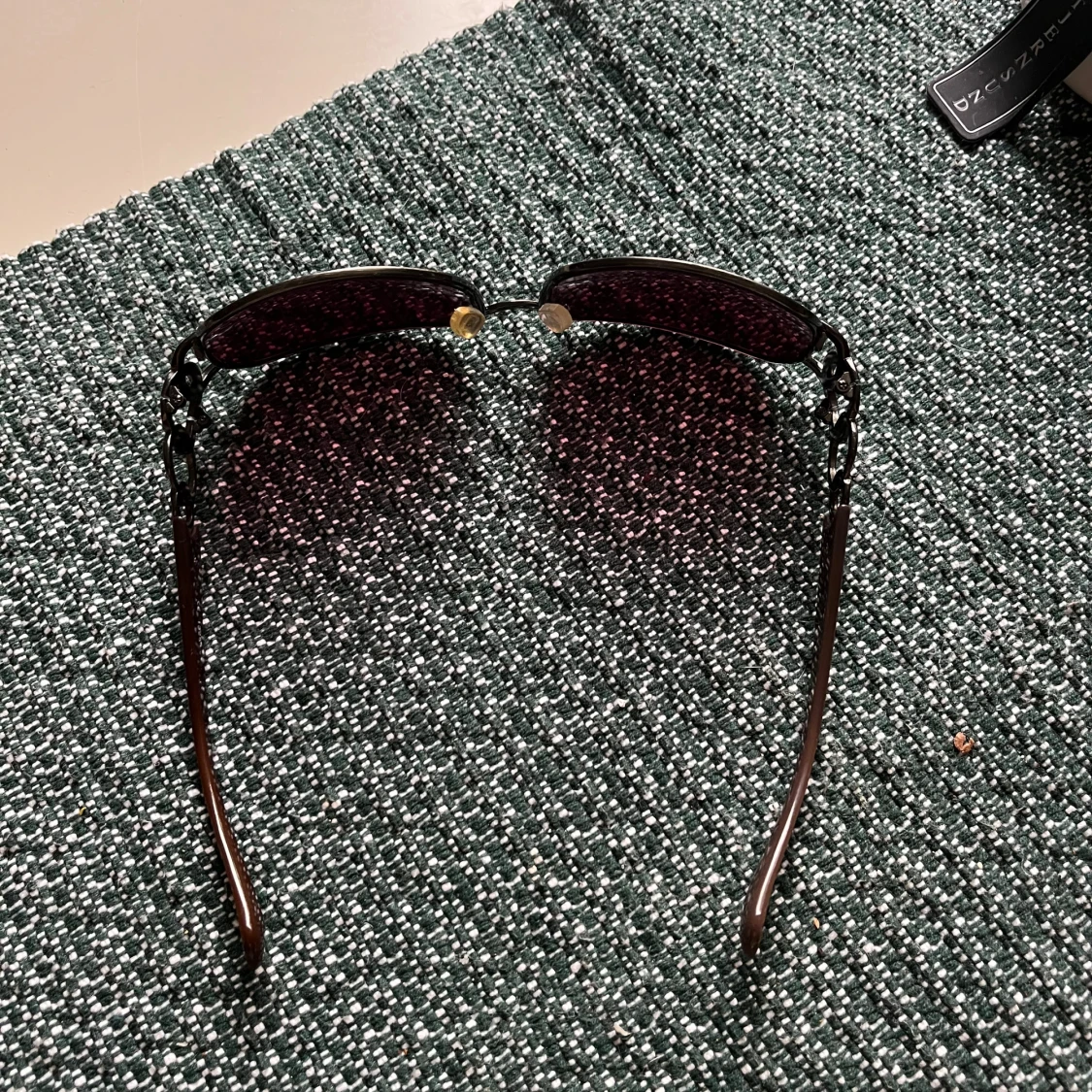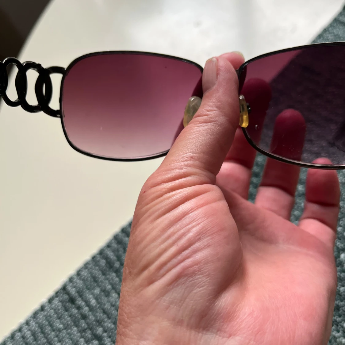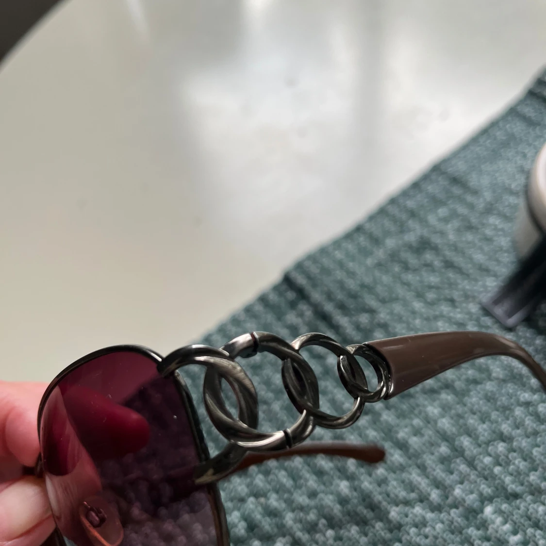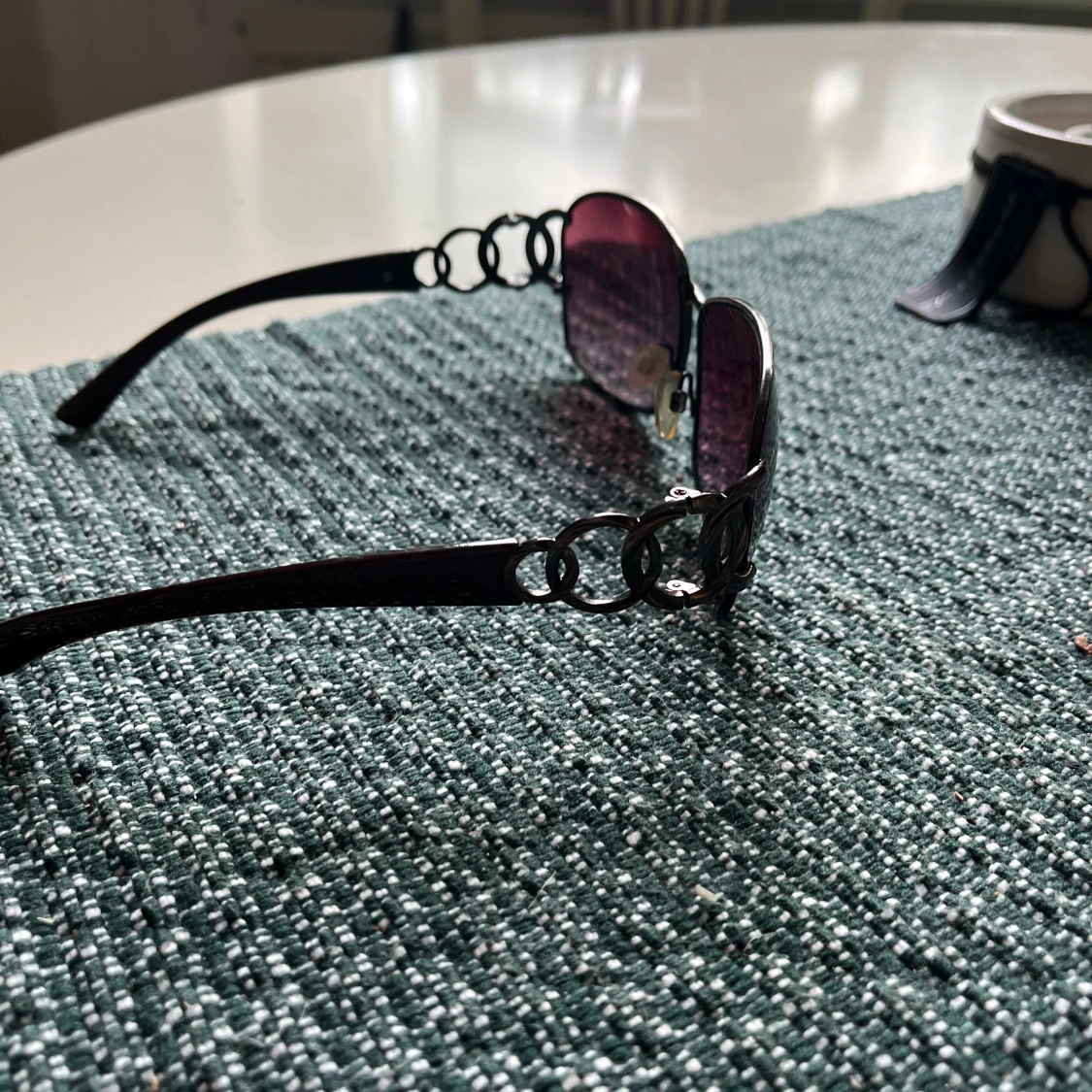 Snygga solglasögon med svarta metallbågar och stora, fyrkantiga glas i mörkt lila ton. Sidorna har coola ringdetaljer som ger en unik vibe. Perfekta för att lyfta din stil och skydda ögonen mot solen.