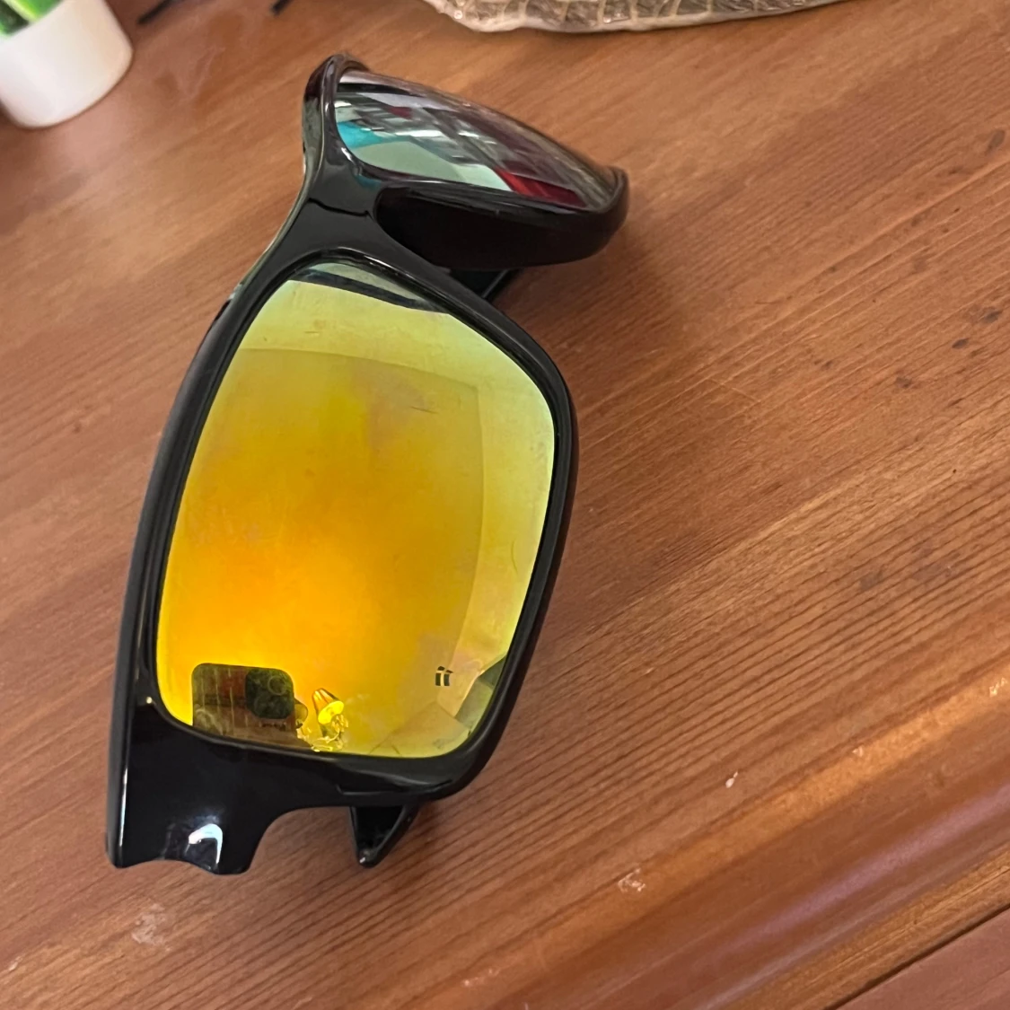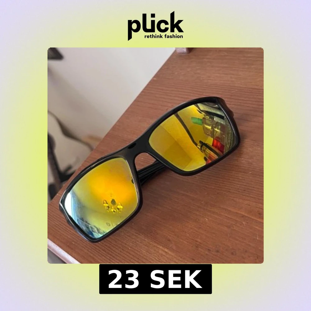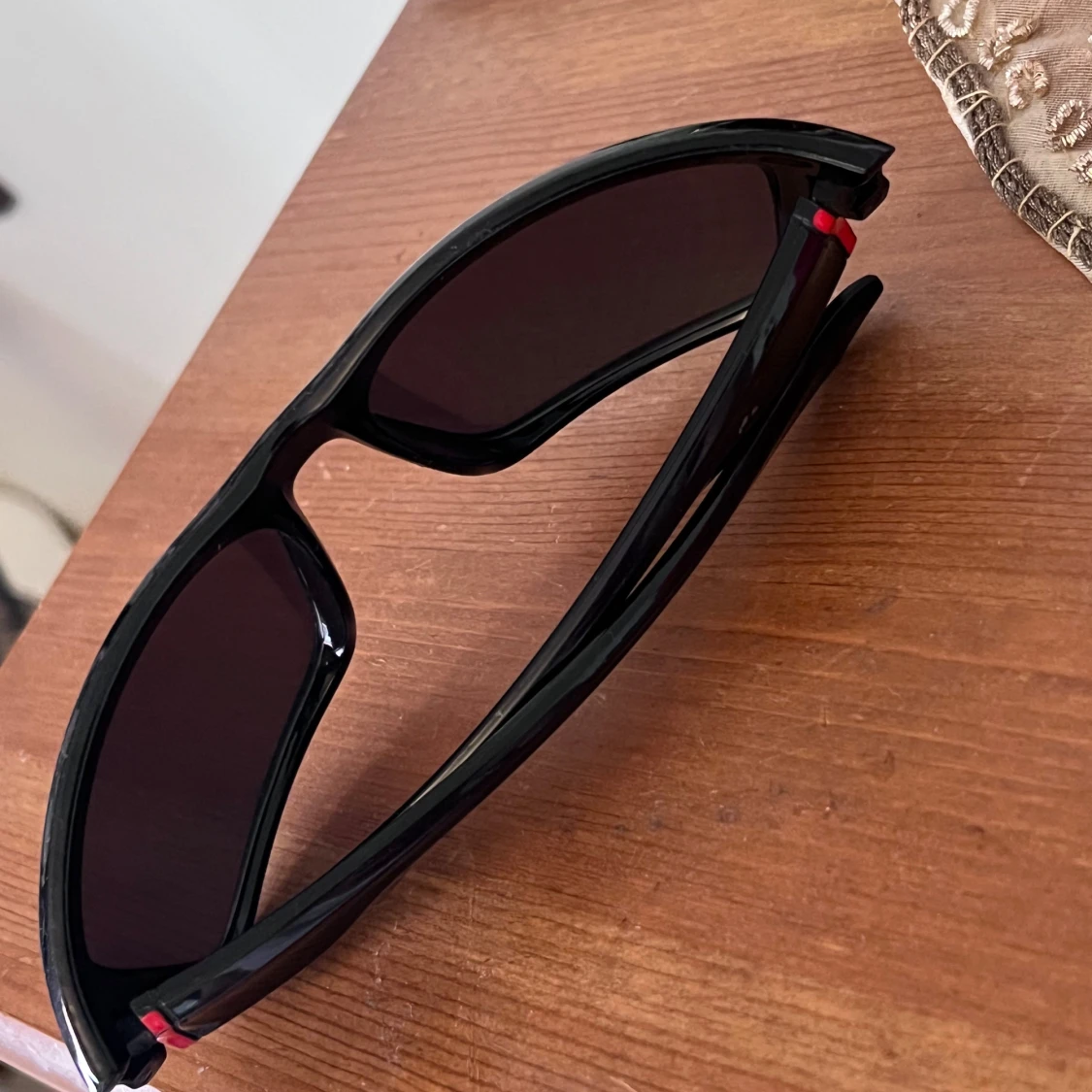 Säljer ett par svarta solglasögon med breda bågar och gula spegelglas. Glasögonen har en sportig design med röda detaljer vid gångjärnen. Perfekta för dig som gillar en cool och modern look. Ramen är i blank plast och glasen är rektangulära.