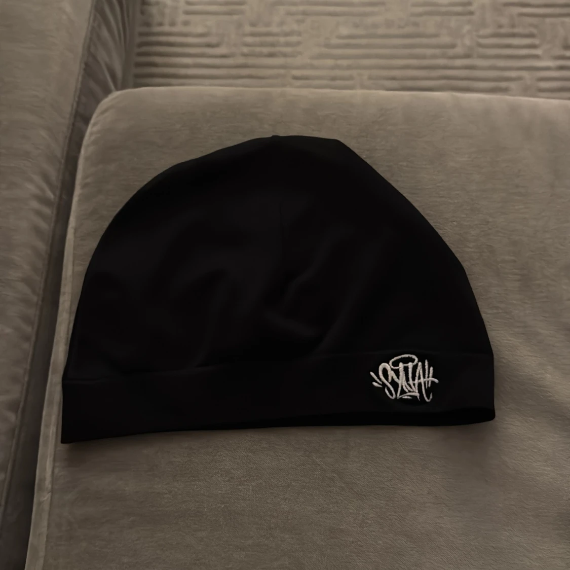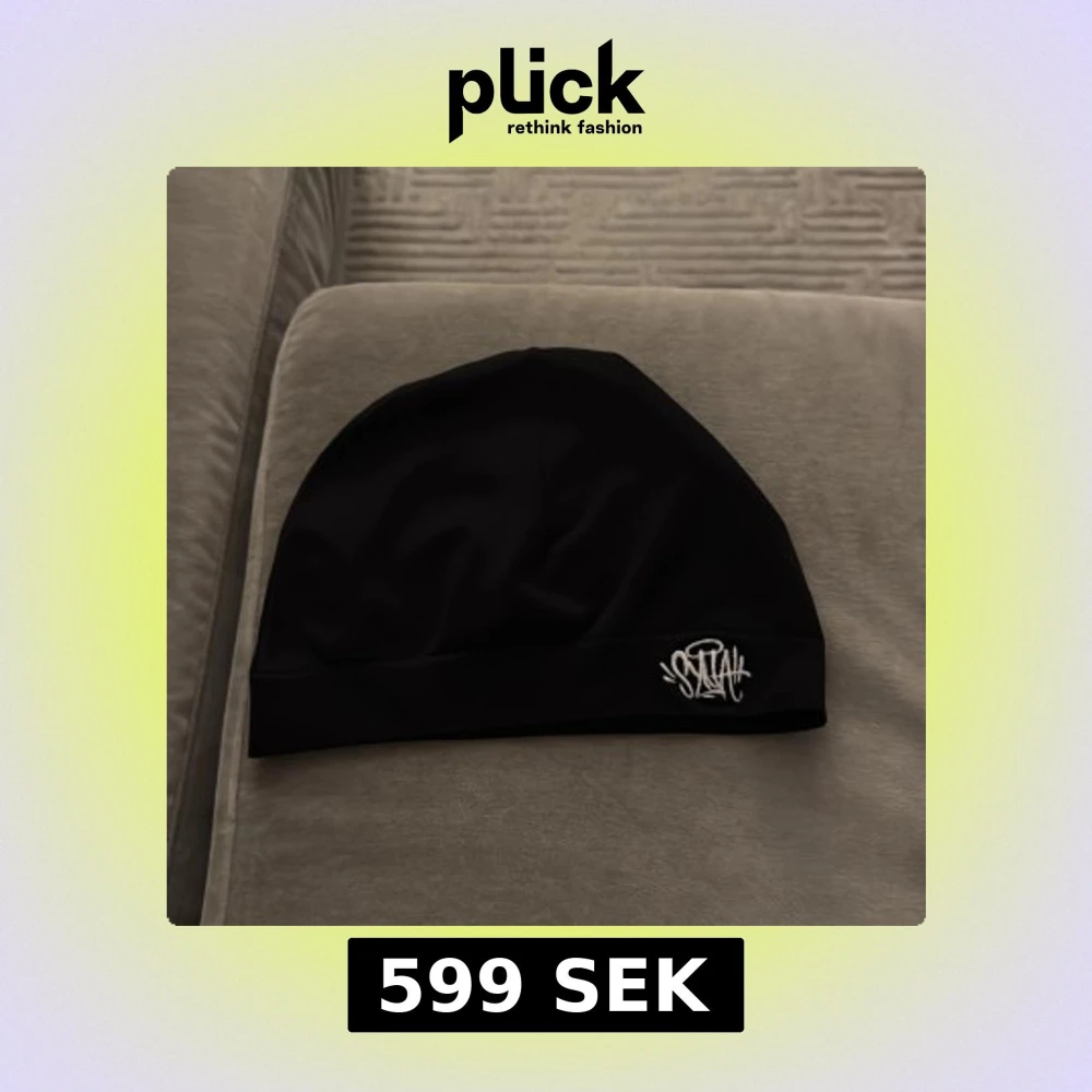 Svart, slimmad mössa från Syna World med vit broderad logga framtill. Perfekt för kalla dagar och enkel att matcha med olika outfits. Tillverkad i mjukt syntetmaterial som sitter skönt på huvudet.