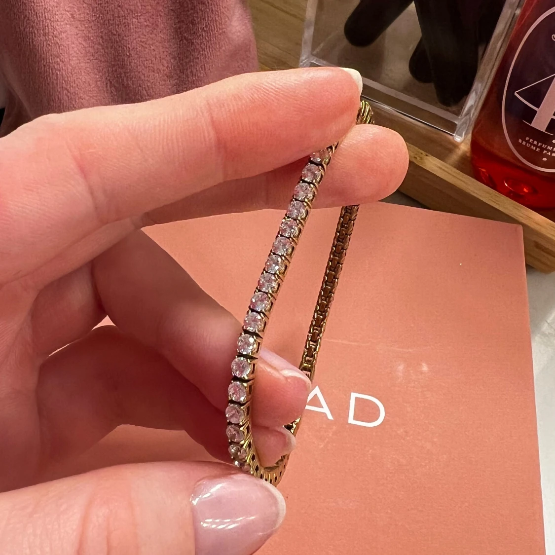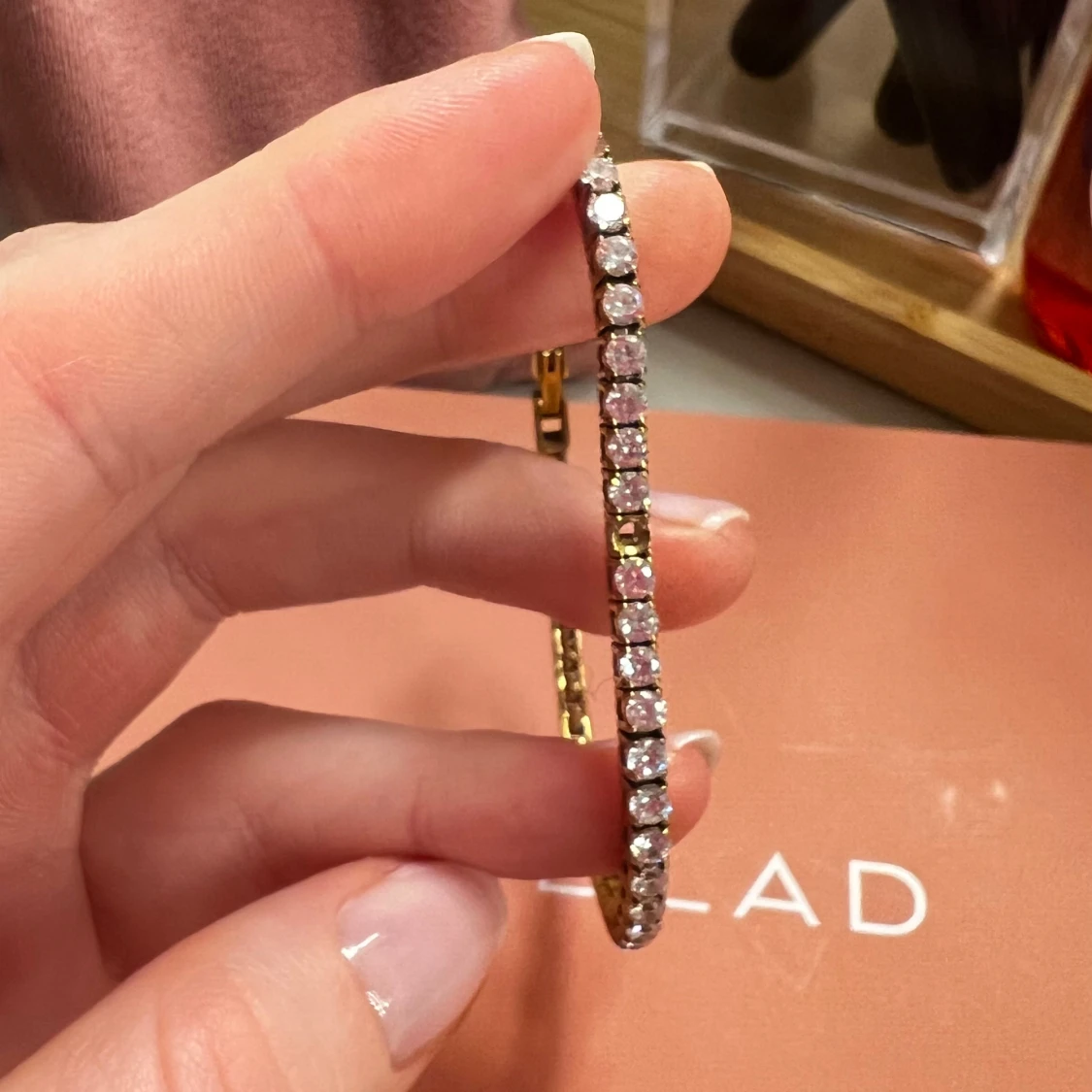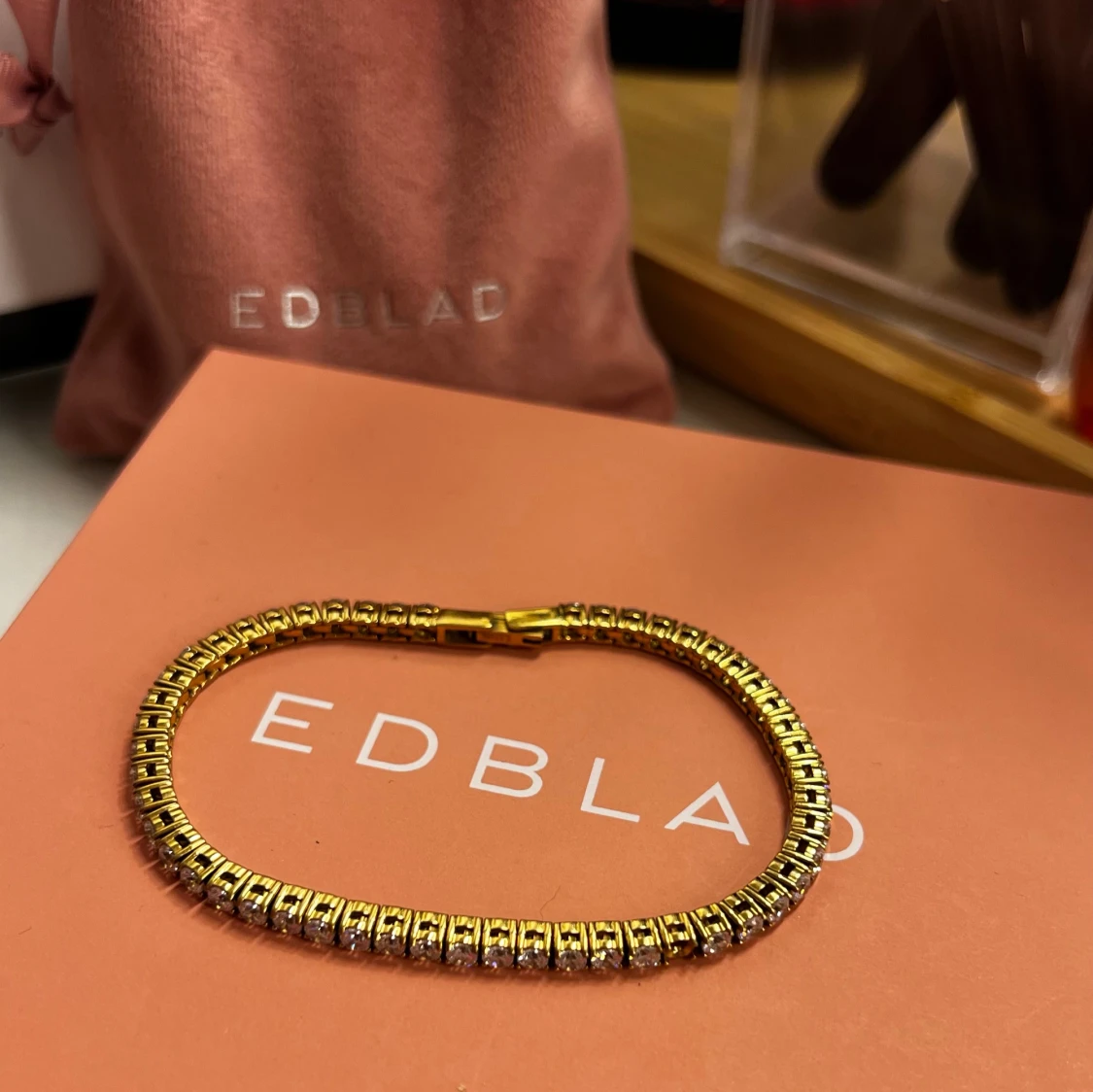 Säljer nu mitt Tennis armband från Edblad då jag har köpt ett nytt i en mindre storlek. Armbandet är i fint skick och den enda defekten är att den tappat en sten, men inget som märks av när man har på sig det. Nypris 799kr. Storlek Large