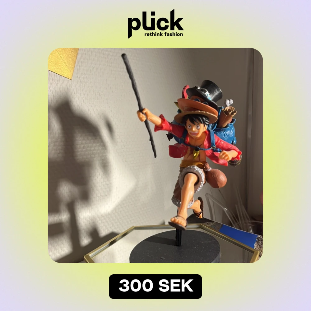 Monkey D. Luffy figur. Pinnen går att ta bort och sitter inte fast. Mycket fina detaljer från de olika arken. Även alla 3 brödernas hattar på. Figuren står på ett svart stativ och ser ut att vara i rörelse, vilket ger en dynamisk känsla. Perfekt för fans av äventyr och samlarobjekt!