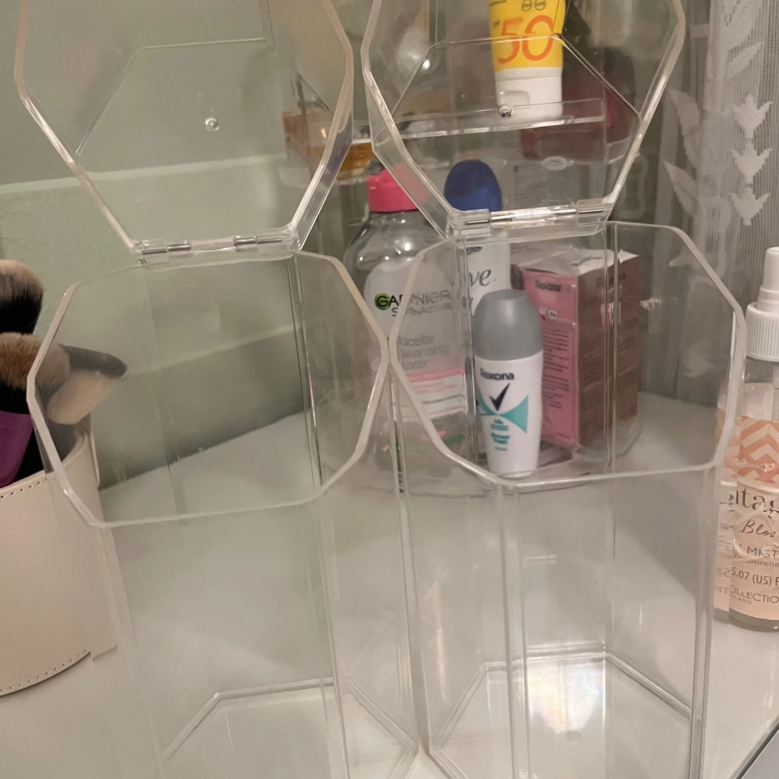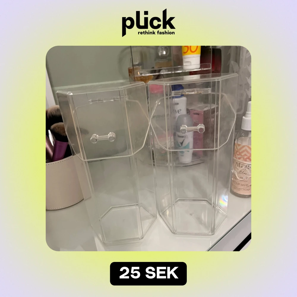 Två transparenta sminkborstar förvaring i plast, perfekta för att organisera smink eller småsaker på ditt sminkbord. De har en enkel och stilren design med en sexkantig form och är lätta att rengöra. Passar bra i badrum eller på sminkbordet för att hålla ordning och reda.
