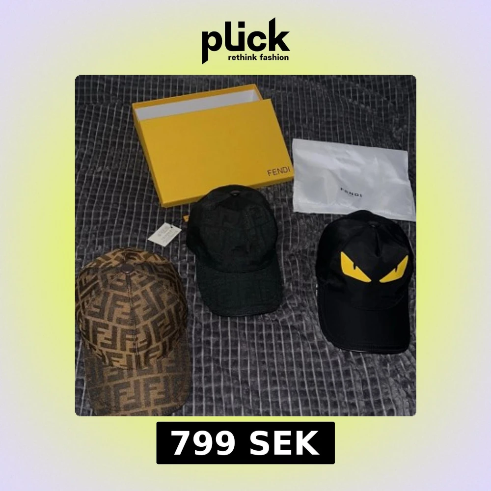 Säljer tre stiliga kepsar från Fendi. En brun med Fendi-logotypmönster, en svart med gula ögonmotiv och en enkel svart keps. Perfekta för att ge din outfit en lyxig touch. 799kr för en.