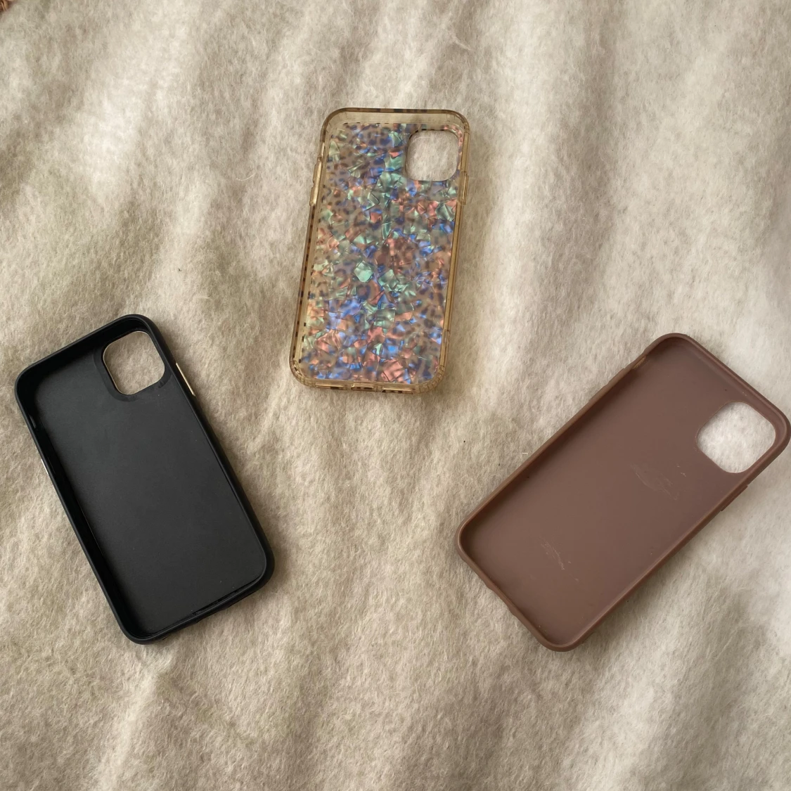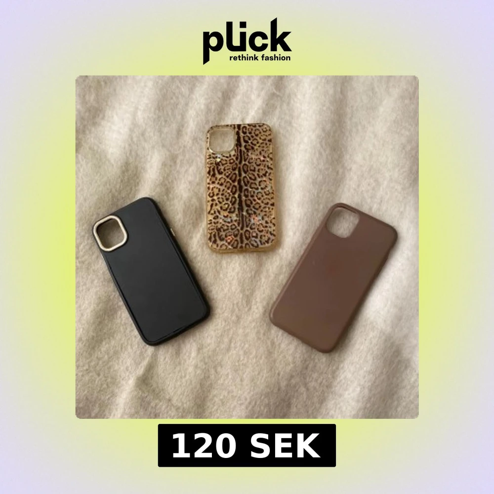 Säljer tre snygga mobilskal: ett svart med gulddetalj runt kameran, ett brunt i matt finish och ett transparent skal med leopardmönster och glittriga inslag. De passar iPhone 11 och alla är från H&M💕. Alla 3 skal för 120, 1 för 50💕 *de svarta skalet är lite sönder på kanten men inget som man tänker på.