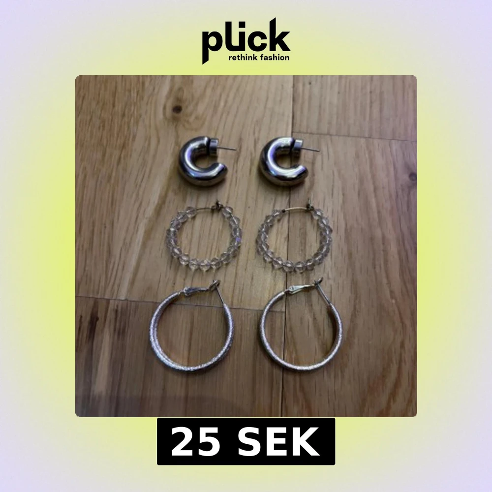 Säljer tre par örhängen: chunky silvriga hoops med rundad form, ett par glittriga hoops med transparenta pärlor och ett par tunna silvriga hoops med textur. Perfekt för dig som gillar att mixa stilar och vill ha något som sticker ut. Använd men i mycket bra skick