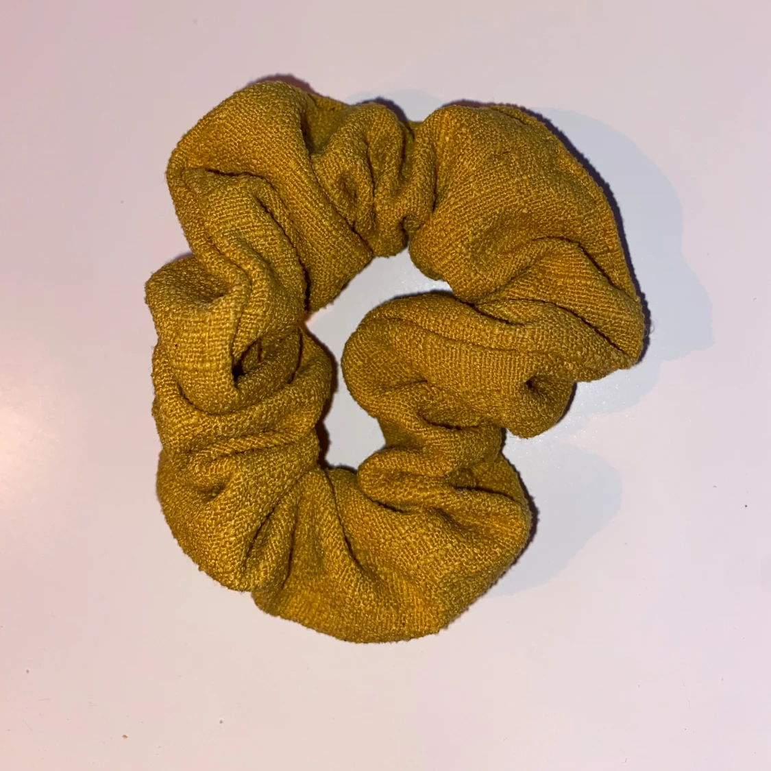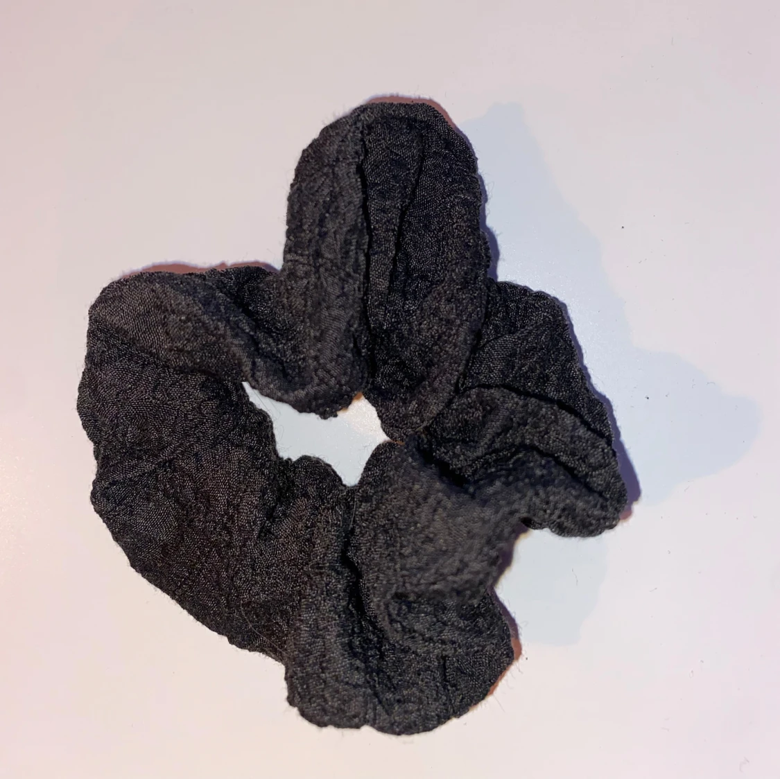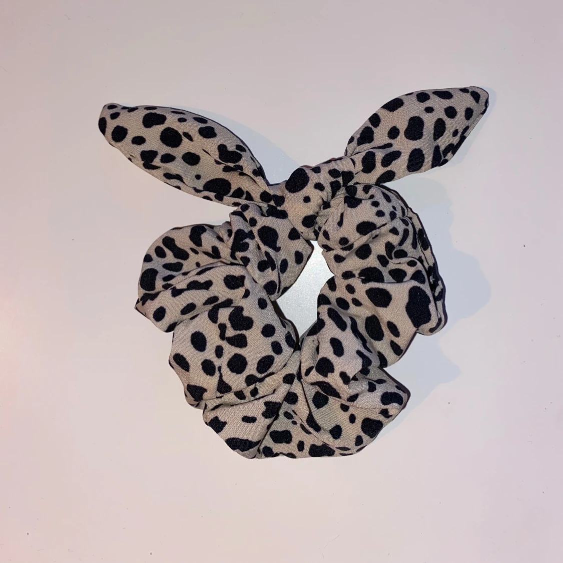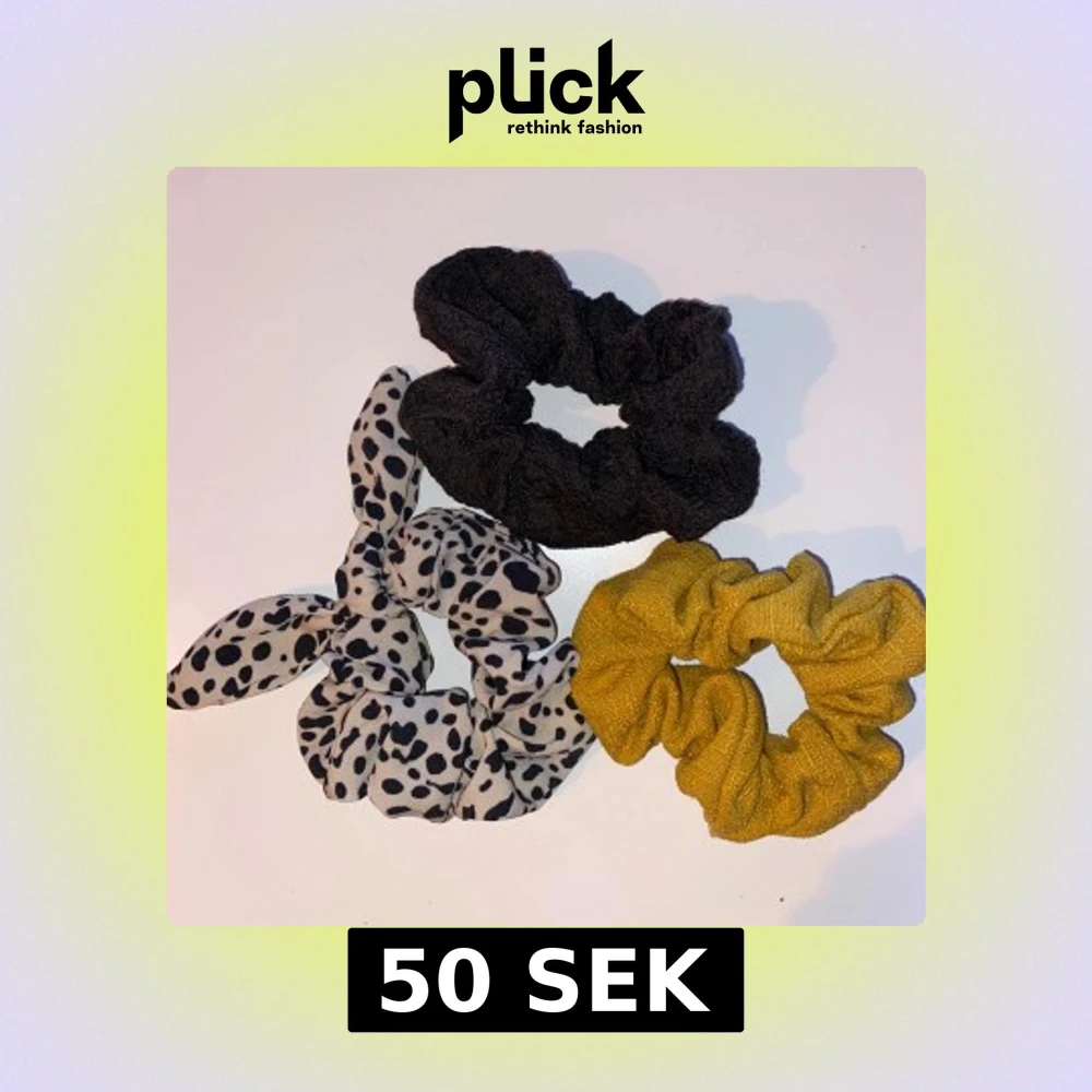 Säljer tre scrunchies: en svart, en gul och en beige med svarta prickar och rosett. Perfekta för att ge din frisyr en extra touch!