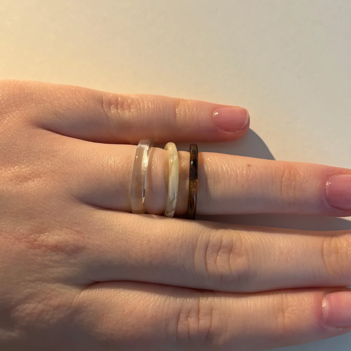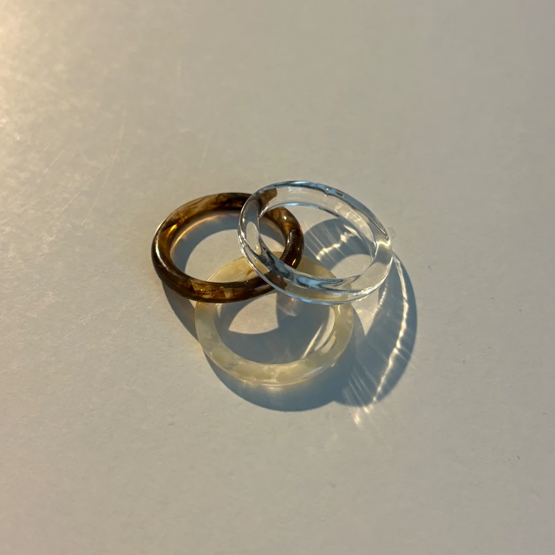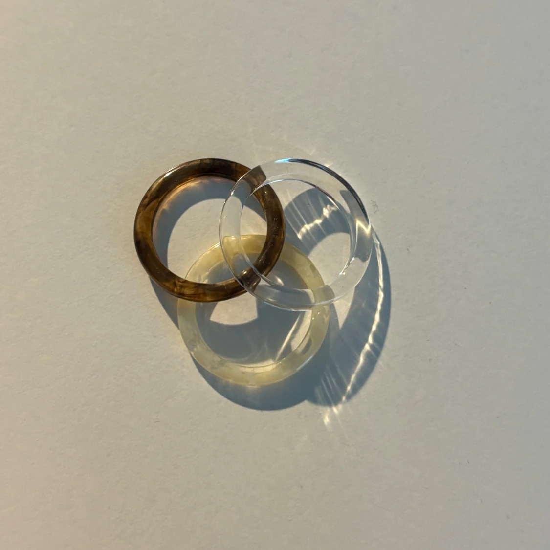 Säljer två stilrena ringar i akryl, en i klar transparent och en i brun nyans. Perfekta för att addera en modern touch till din look. De är lätta och bekväma att bära.