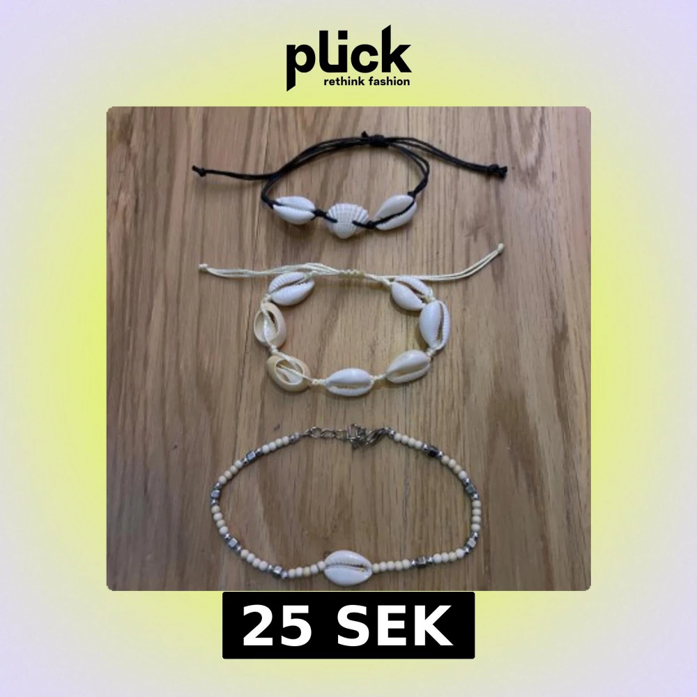 Säljer tre strandiga armband med snäckor. Ett med svart snöre och tre vita snäckor, ett med ljusgult snöre och flera snäckor, samt ett med små pärlor och silverfärgade detaljer plus en snäcka i mitten. Perfekt för chill vibe och beach-look.