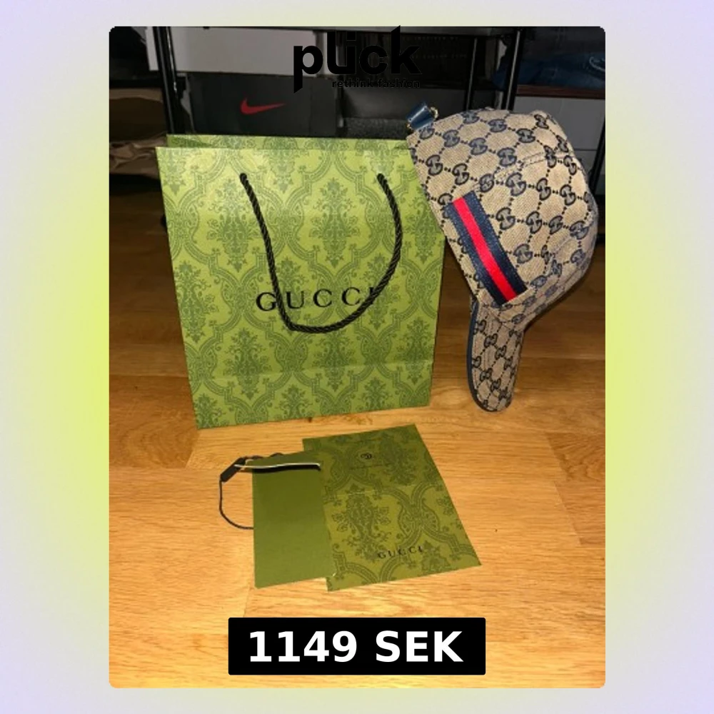 Exklusiv Gucci keps i beige med klassiskt GG-monogram i blått, röd-blå rand på sidan och justerbart blått läderband bak. Tillverkad i 100% bomull och läderdetaljer. Säljes med originalpåse och tags. Perfekt för dig som vill sticka ut med lyxig streetstyle.