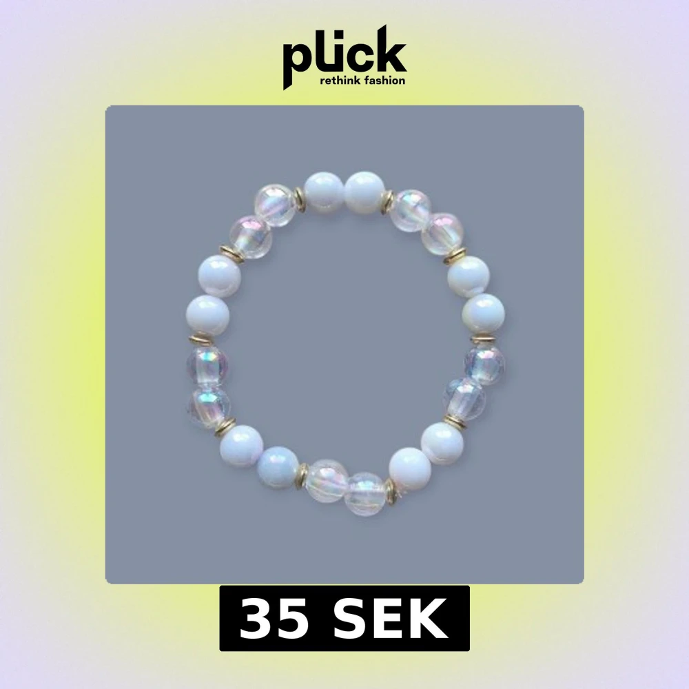 Superfint armband med vita och transparenta glittriga pärlor, varvat med små guldfärgade detaljer. Stretchig modell som passar de flesta handleder.