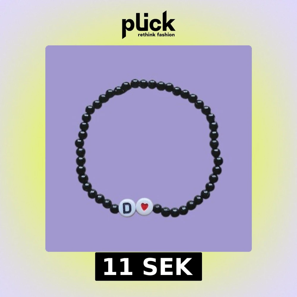 Stilrent svart pärlarmband med små runda pärlor och två vita pärlor framtill, en med bokstaven D och en med ett rött hjärta. Perfekt accessoar för att ge din outfit en personlig touch.