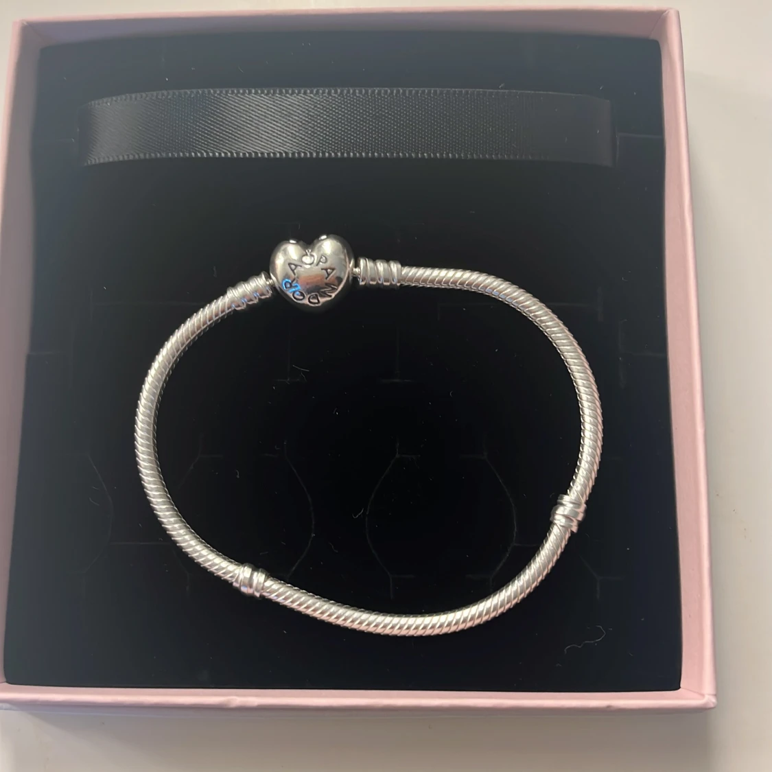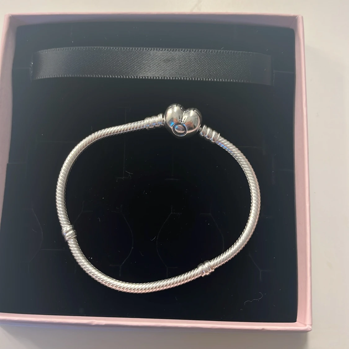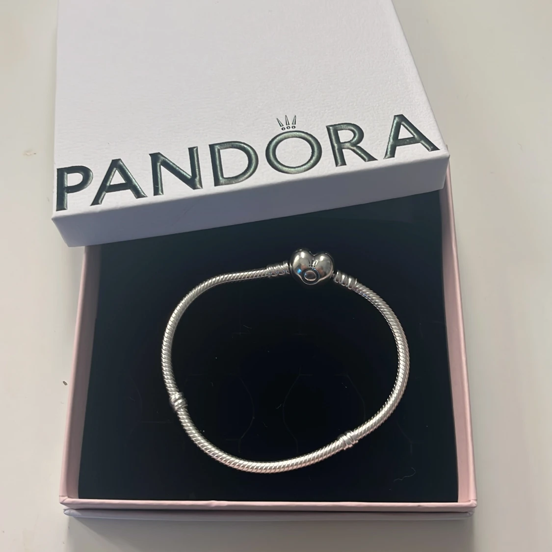 Snyggt silverfärgat armband från Pandora med ett hjärtformat lås. Armbandet har en tvinnad design och låset är dekorerat med Pandora-loggan. Perfekt för att kombinera med dina favoritberlocker. Helt nytt, enbart testat men tyvärr för stort!