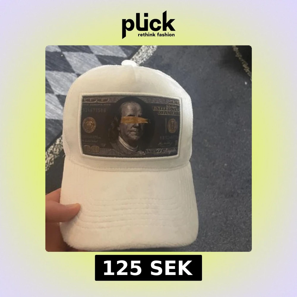 Säljer en vit trucker keps från D’Arigato med mesh på sidorna och ett stort patch framtill med dollartryck i svart och guld. Skön passform och cool detalj som sticker ut. Perfekt för dig som gillar streetwear och vill ha något unikt.