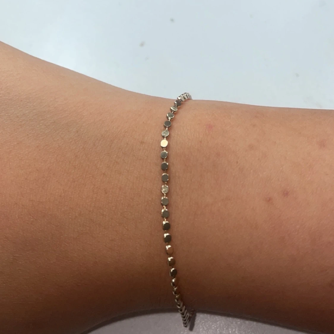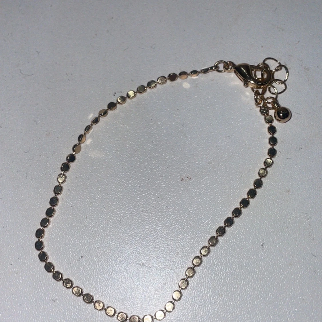 Supersnyggt och minimalistiskt armband i guld med små, blanka cirklar längs hela kedjan. Perfekt för dig som gillar diskreta detaljer och vill ha något som glittrar lite extra på handleden. Justerbar längd med flera ringar vid låset.