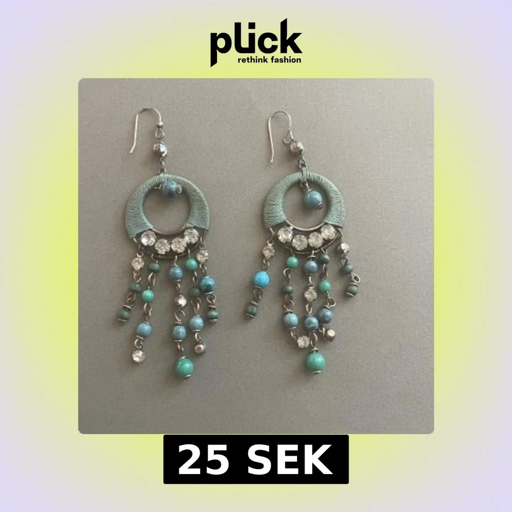 Stora örhängen med turkosa och blå pärlor, dekorerade med glittrande strass. Runda ringar i metall med lindat turkost snöre och hängande kedjor med pärlor i olika blå och gröna nyanser.
