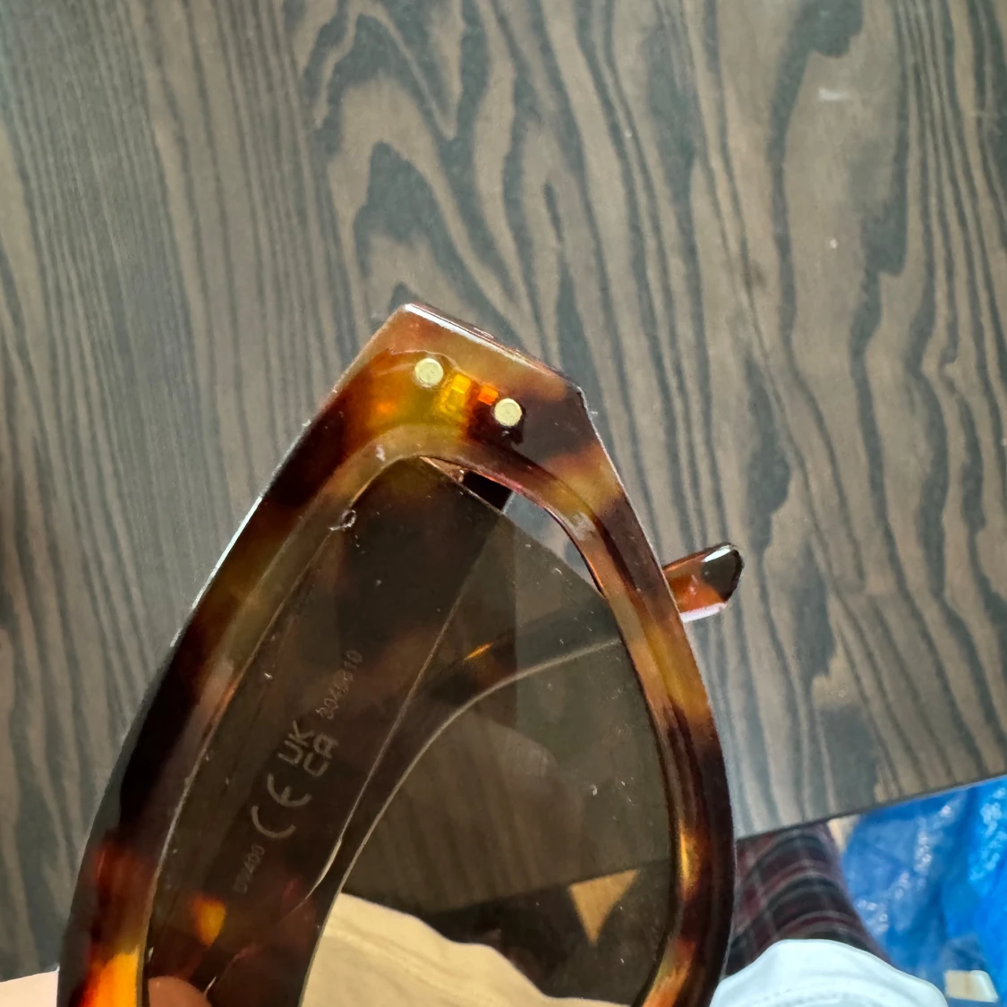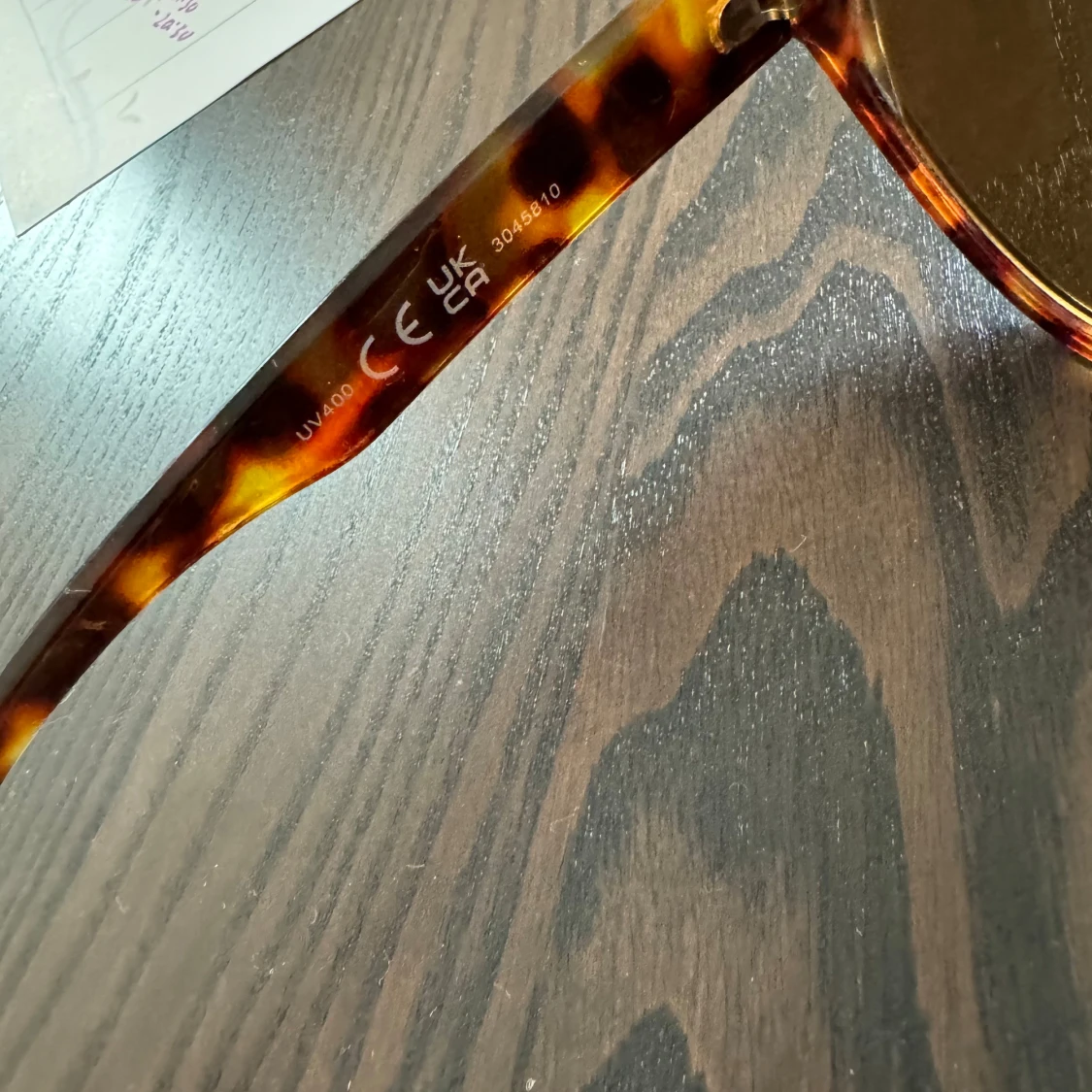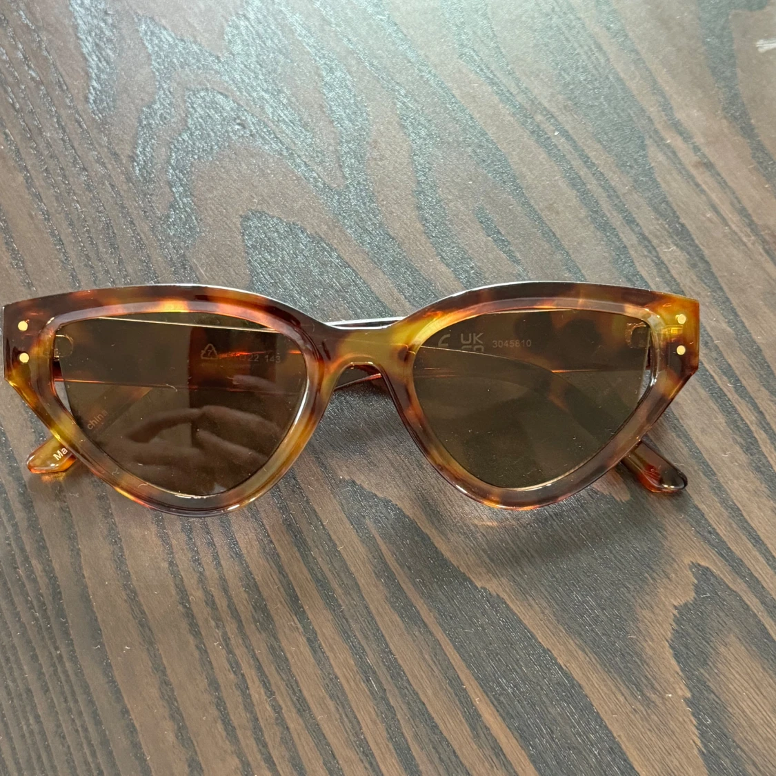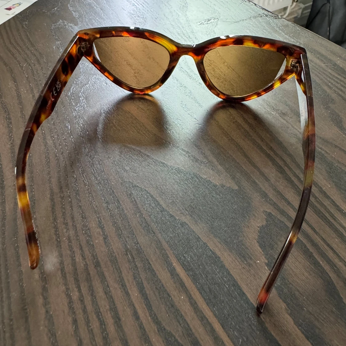 Säljer ett par snygga turtle-mönstrade solglasögon. De har en cat-eye form och är i ett brunt sköldpaddsmönster. Glasögonen är i nyskick och har en normal passform. De har dock ett glapp vid sidan, se detaljbilden. Inget som syns när man har dem på sig.