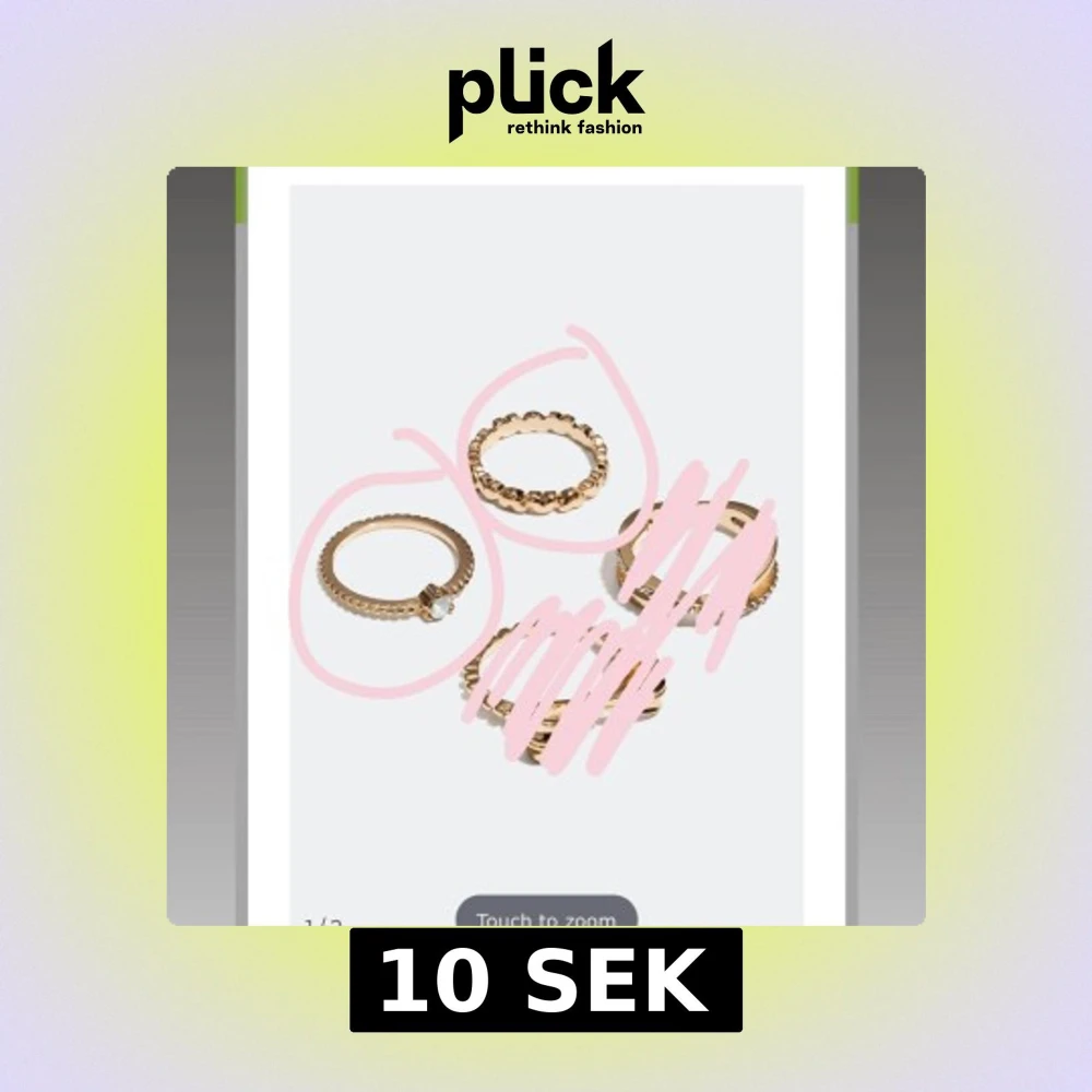 Säljer två snygga ringar i guldton. Ena ringen har ett unikt mönster med små hjärtformade detaljer runt hela bandet, medan den andra har en glittrig sten framtill och ett räfflat band. Perfekt för dig som gillar att mixa och matcha smycken.