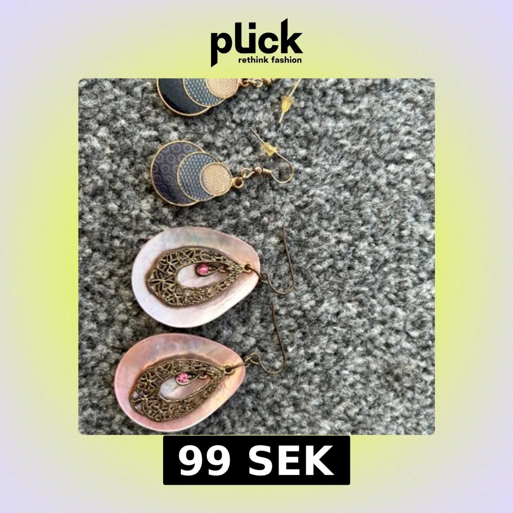 Säljer två par örhängen. Ett par i guld och svart med geometriskt mönster och ett par med rosa skal och antik guldfärgad metall med rosa stenar. Perfekt för att ge en unik touch till din outfit!