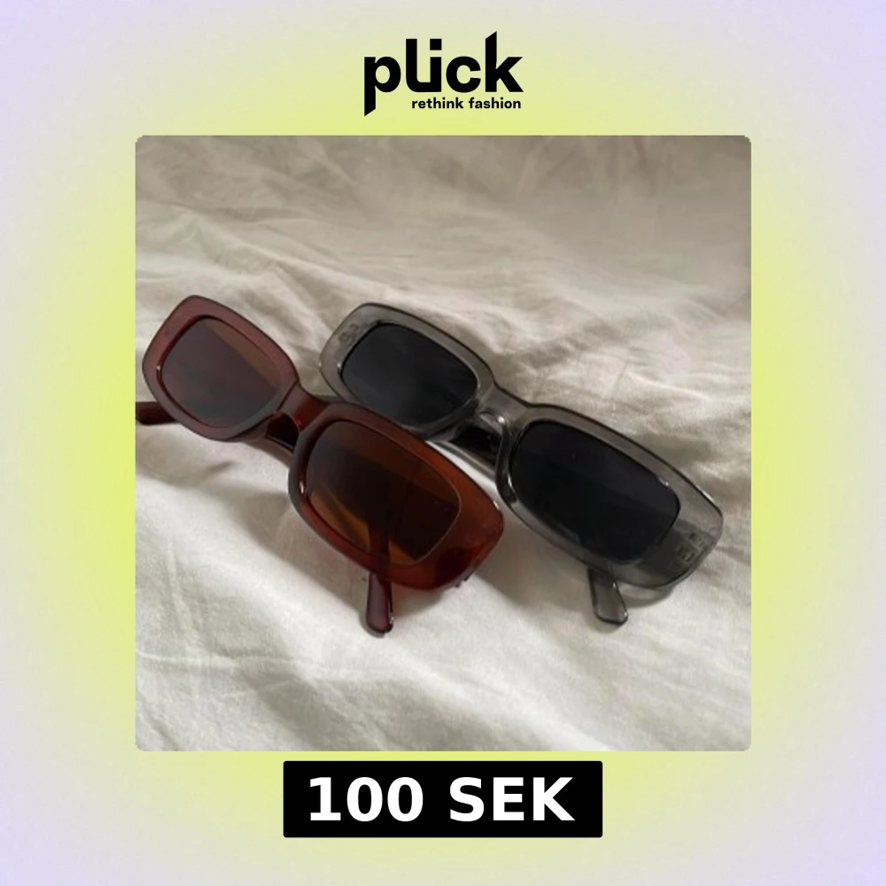1 = 70 kr. 2 = 120 kr. Säljer två par trendiga solglasögon med rektangulära bågar. Ena paret har transparent grå båge med svarta linser, det andra har transparent brun båge med bruna linser. Båda är i plast och har en cool, retro vibe som passar perfekt till streetstyle.