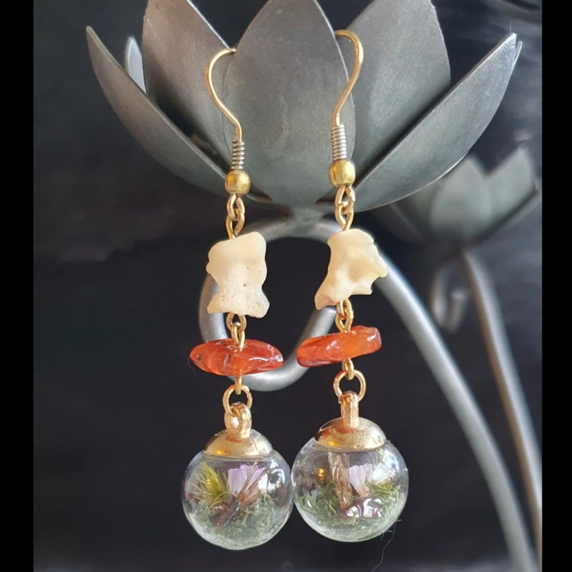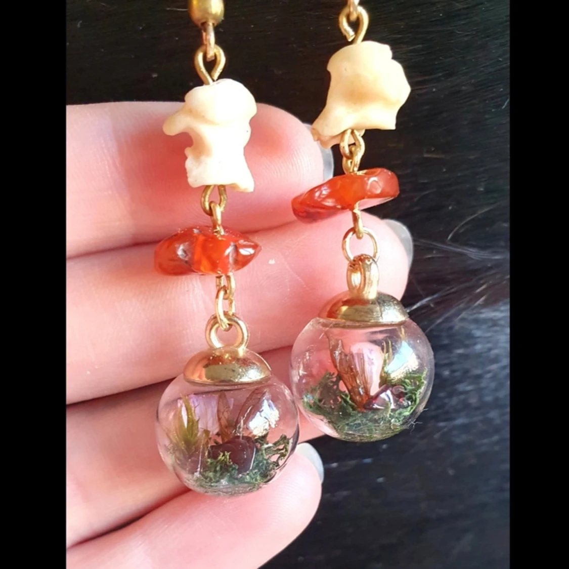 Säljer ett par unika örhängen med ben från grävling och röd agat. Örhängena har en glaskula fylld med mossa, blommor, skärvor av röda granater samt vingar från bin.