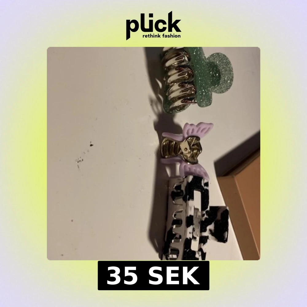 Säljer tre snygga hårklämmor: en glittrig grön, en lila med vingar och en svartvit med coolt mönster. Perfekta för att fixa frisyren snabbt och ge din look en extra touch. Klämmorna är i plast och metall och passar både till vardags och när du vill sticka ut lite extra. En kostar 15kr och alla tre för 35kr.