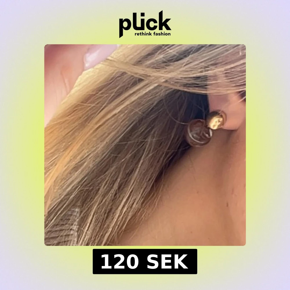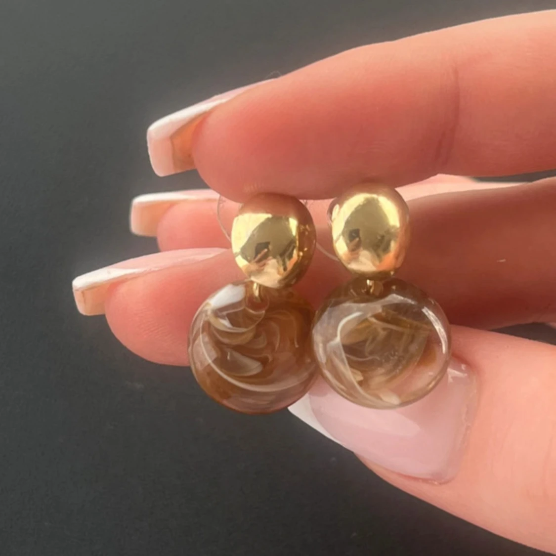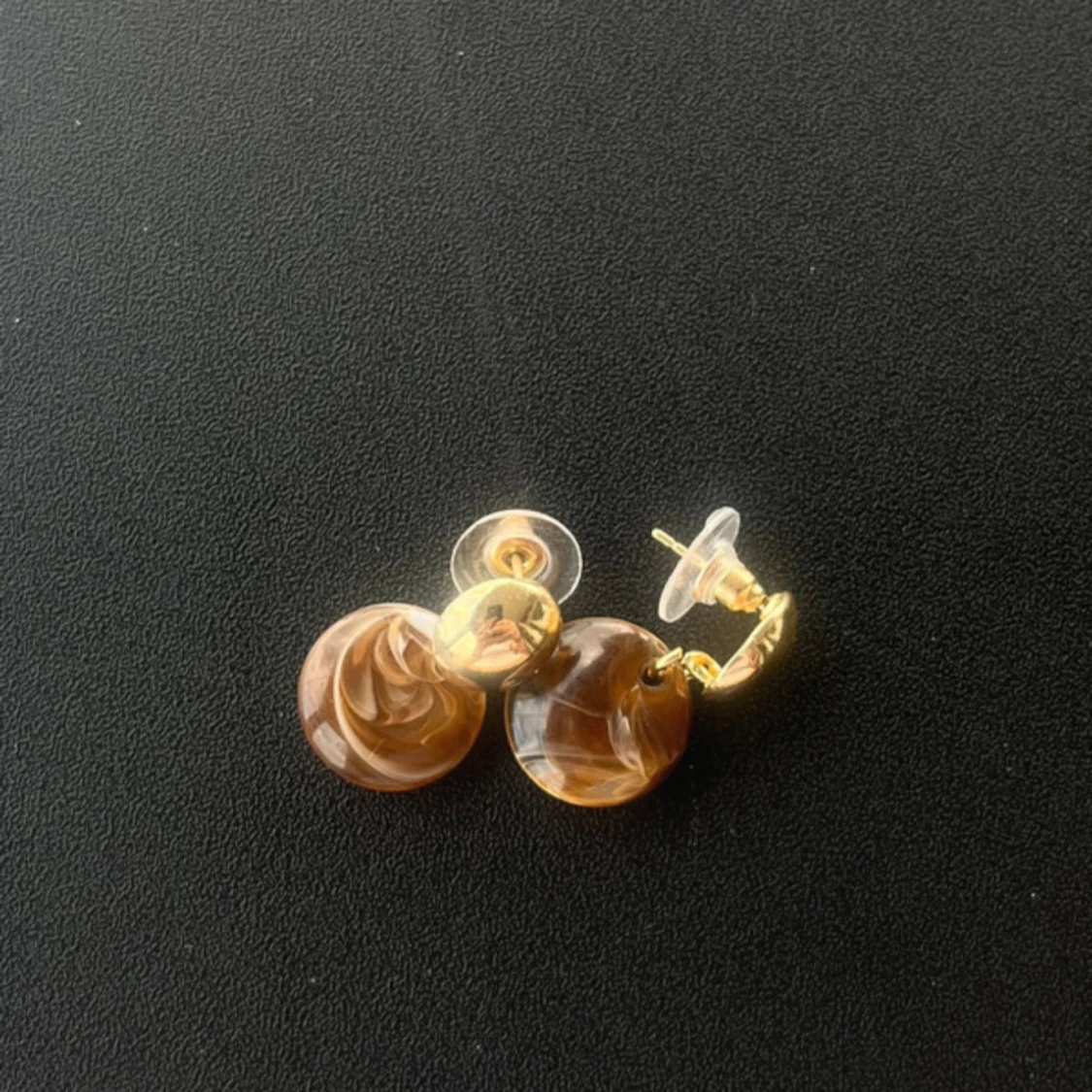 Snygga örhängen med rund, guldig plupp och hängande brun swirlad detalj i akryl. De har en cool, glansig finish och mixar guld med transparent brunt för en unik look. Perfekta för att ge din outfit lite extra edge.