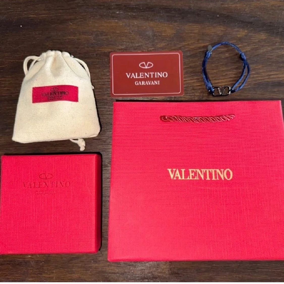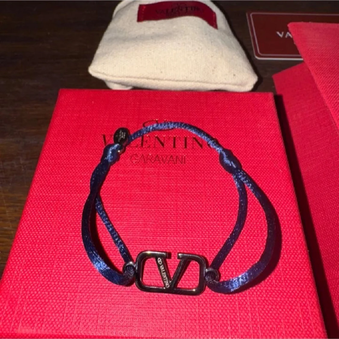 Snyggt armband från Valentino Garavani med marinblått band och metallspänne med ikoniska V-loggan. Dustbag o allt på bilden tillkommer. Skick 9/10. Priset är inte hugget i sten