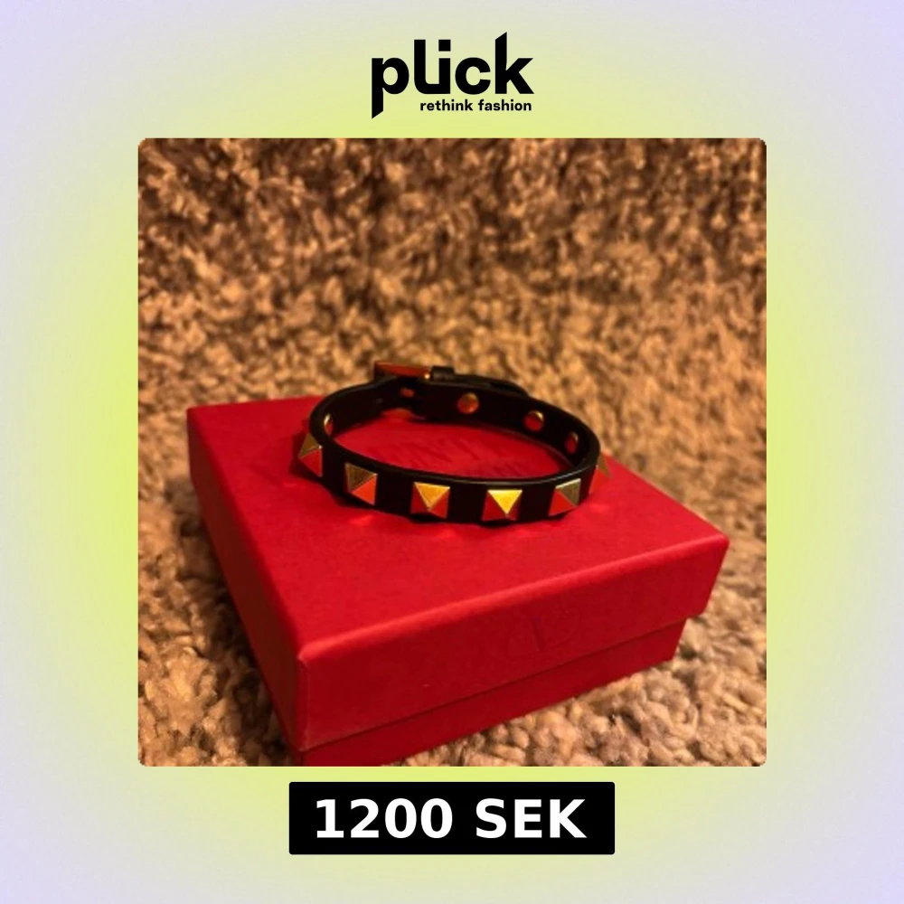 Säljer ett svart armband med guldiga pyramidnitar från Valentino Garavani. Armbandet har justerbar spänne. Allt kommer med original ask, påse och certifikat. Extra bitar finns med. Nypris runt 3000.