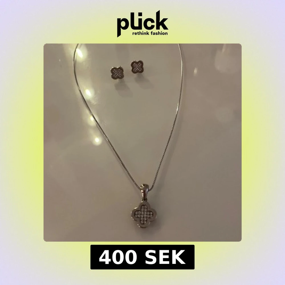 Elegant set med halsband och örhängen. Jag fick den i julklapp men jag säljer den för jag bara använder guld. Perfekt för att ge en touch av glamour till din stil. Stämpeln på halsbandet (se bild), jag tror det står för sterling silver.
