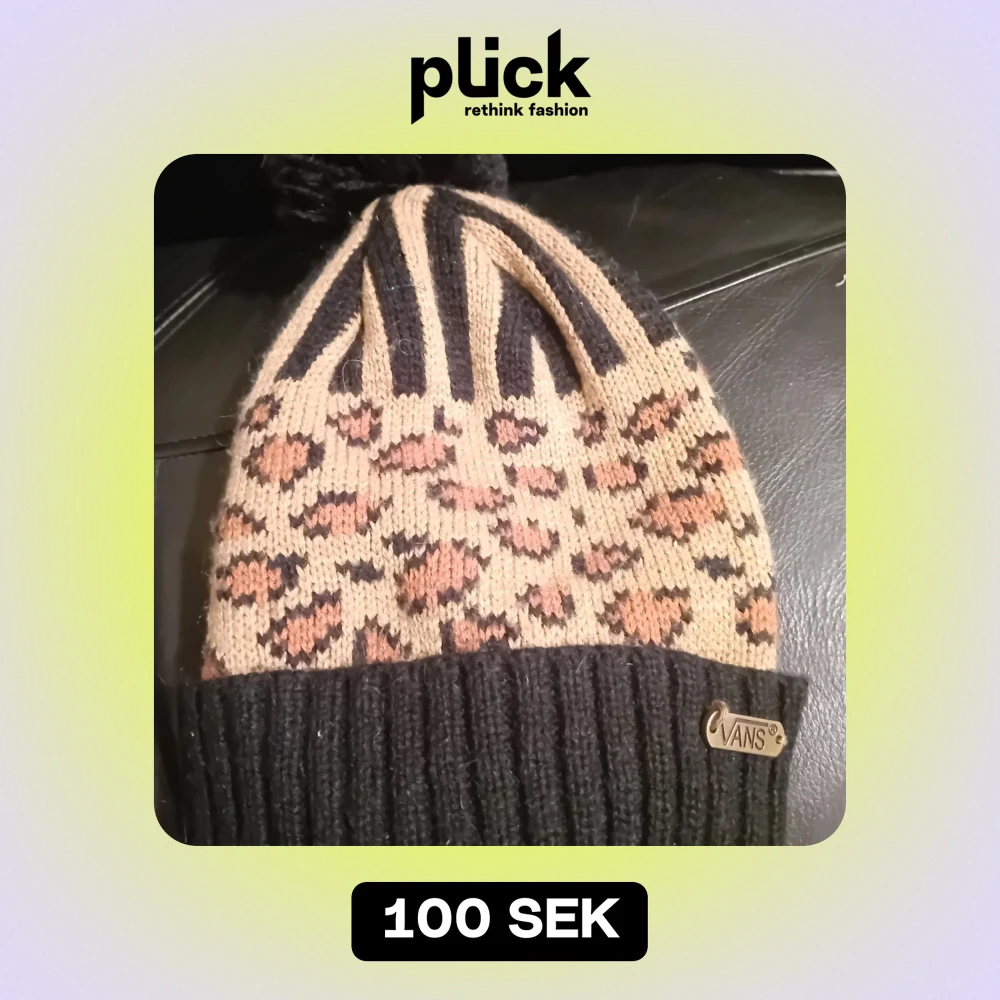 Säljer en supercool leopardmönstrad mössa från Vans. Den är stickad med en mix av beige, svart och brun färg och har en ribbad kant. Perfekt för att hålla sig varm och stilren under höst och vinter. Mössan har en liten tofs på toppen för extra stilpoäng!