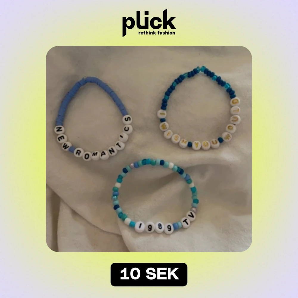 Tre super fina armband med elastiskt snöre. Alla tre är Taylor Swift inspirerade och perfekta om du inte orkar göra armband till the eras tour. Eller om du bara vill ha något fint runt din handled. 1 kostar 10kr/st och alla 3 kostar 25kr